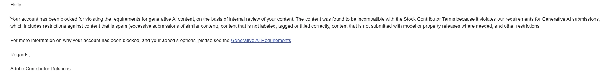 Надеюсь получить совет от сообщества или помощь от представителей Adobe здесь. Мой аккаунт Adobe Stock Contributor был деактивирован 17 марта (как я понимаю, в связи с рекомендациями Gen AI).
