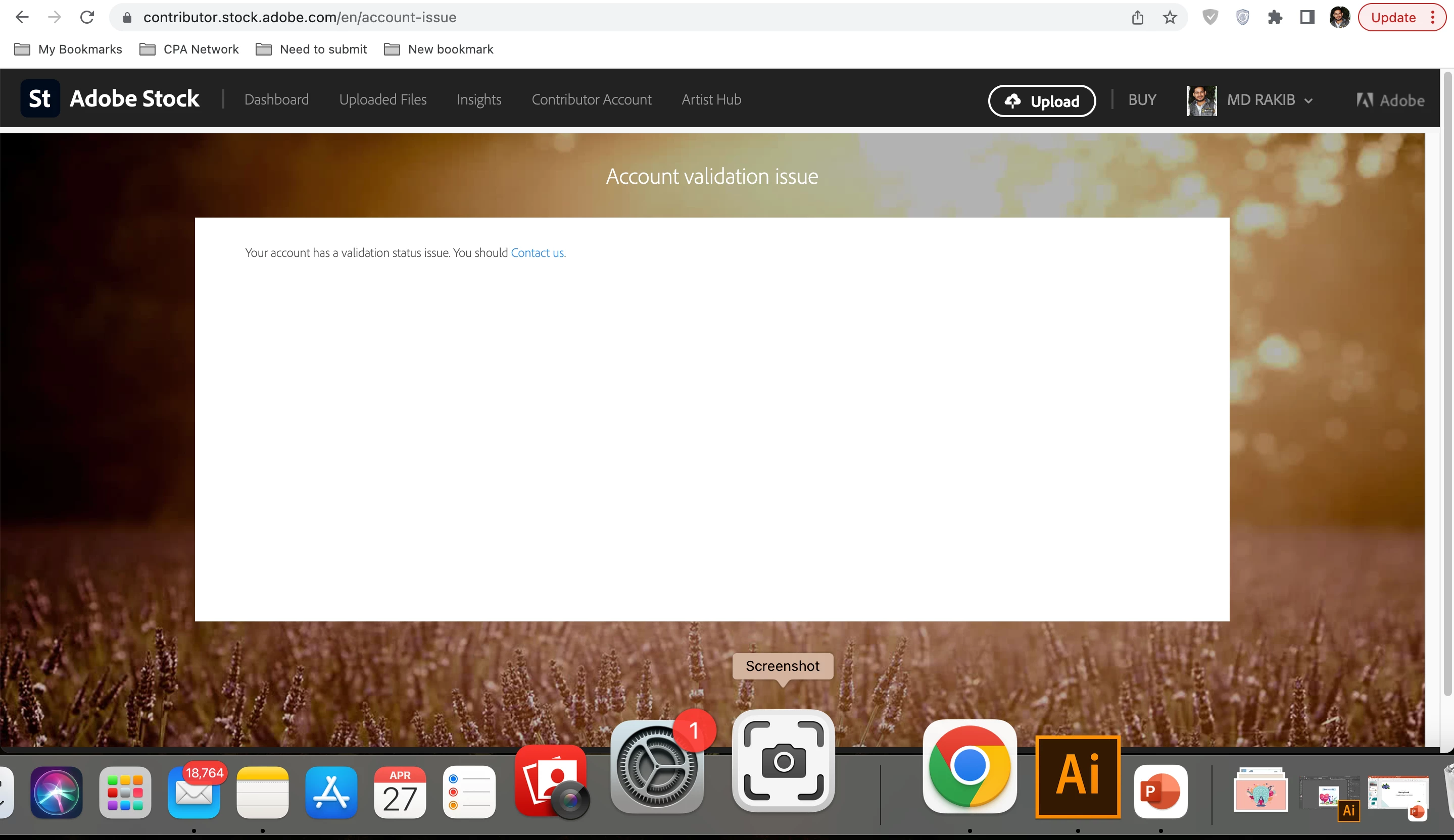 I have a problem with my account. A message appears "Your account has a validation status issue. You should Contact us." on my adobe stock contributor account but I don't get any email with a valid reason and also don't know why this happen. I try to click contact us and send mail but no response from Adobe. Please help me I'm waiting for the response so I can work again and submit my new design