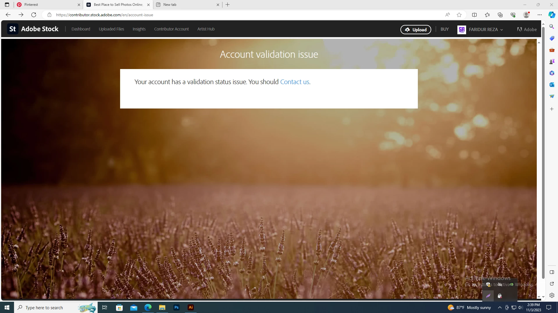 I'm Faridur Reza Sagor, a contributor of Adobe Stock. I've been working as a Graphic Designer on this platform since 2022 . Today I got an error called "Account Validation Issue". Check out the attachment.