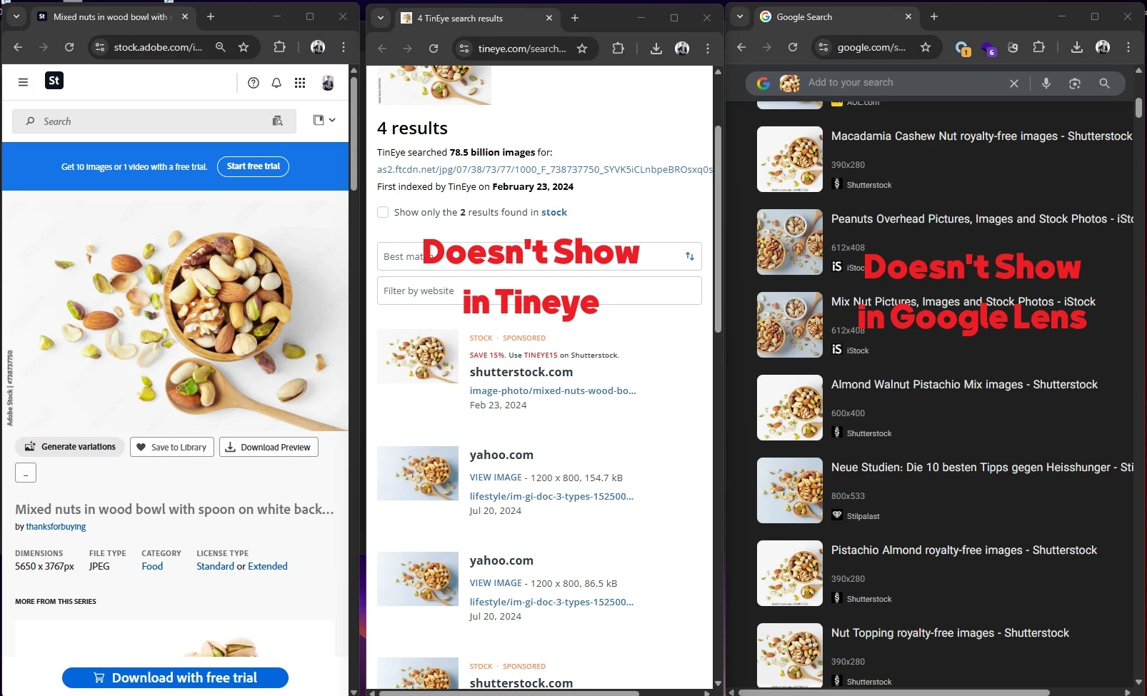This situation is creating a serious issue for me as a customer because I can no longer find and purchase the specific files I need from Adobe Stock. It may also reduce Adobe Stock’s own sales. since sites like Shutterstock and iStock are still heavily visible in TinEye (often as sponsored results) and appear among the top results in Google Lens, while Adobe Stock has now completely vanished from these searches.