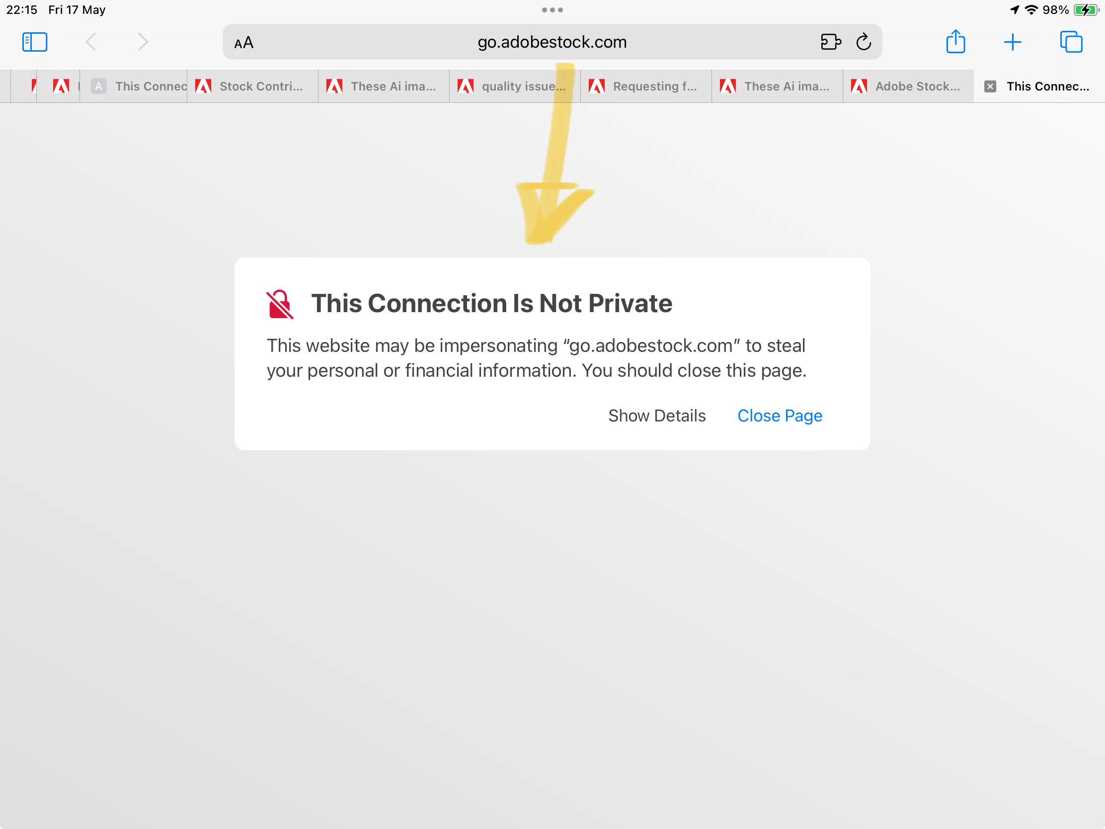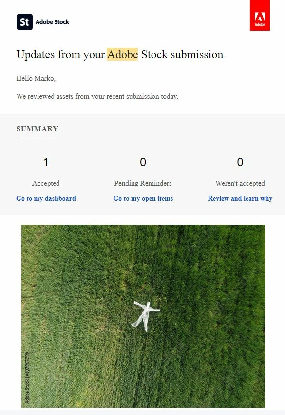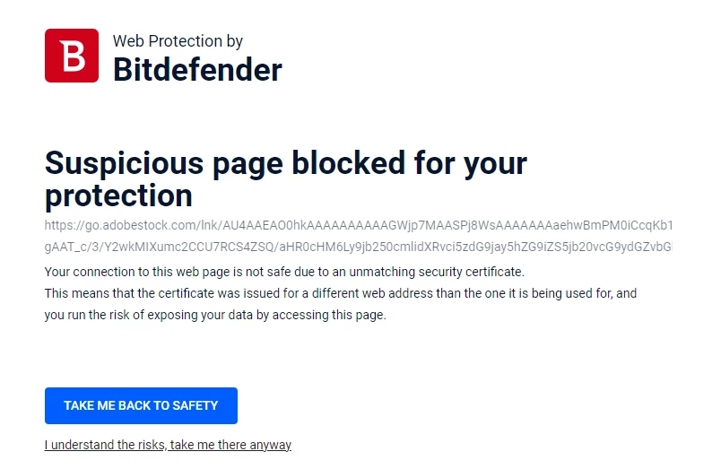 Hi, lately, whenever I upload my images to Adobe Stock, I get an e-mail conformation that my images got accepted. Thats fine, but when I click on the link from my e mail to see which images are accepted, I get reddirected to another page, and my antivirus is warning me that that specific page is suspicious.