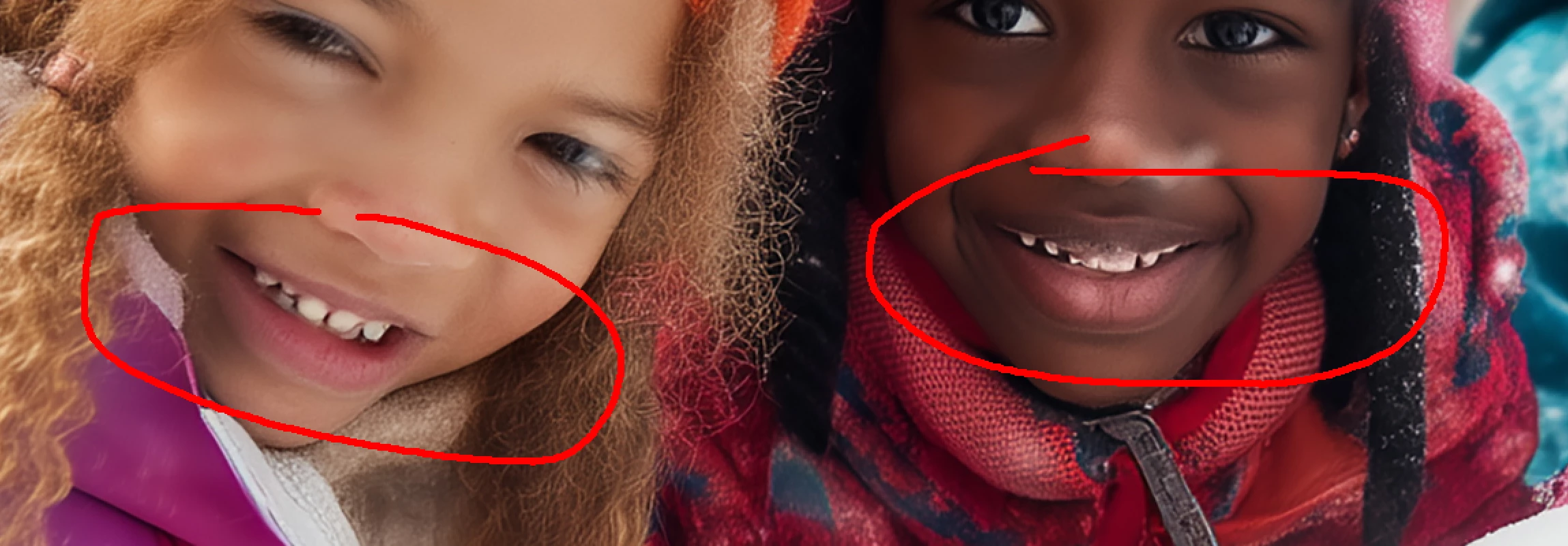 AI has trouble with finer details like apparel, gloves, noses, teeth, and the line of sight that the eyes follow.