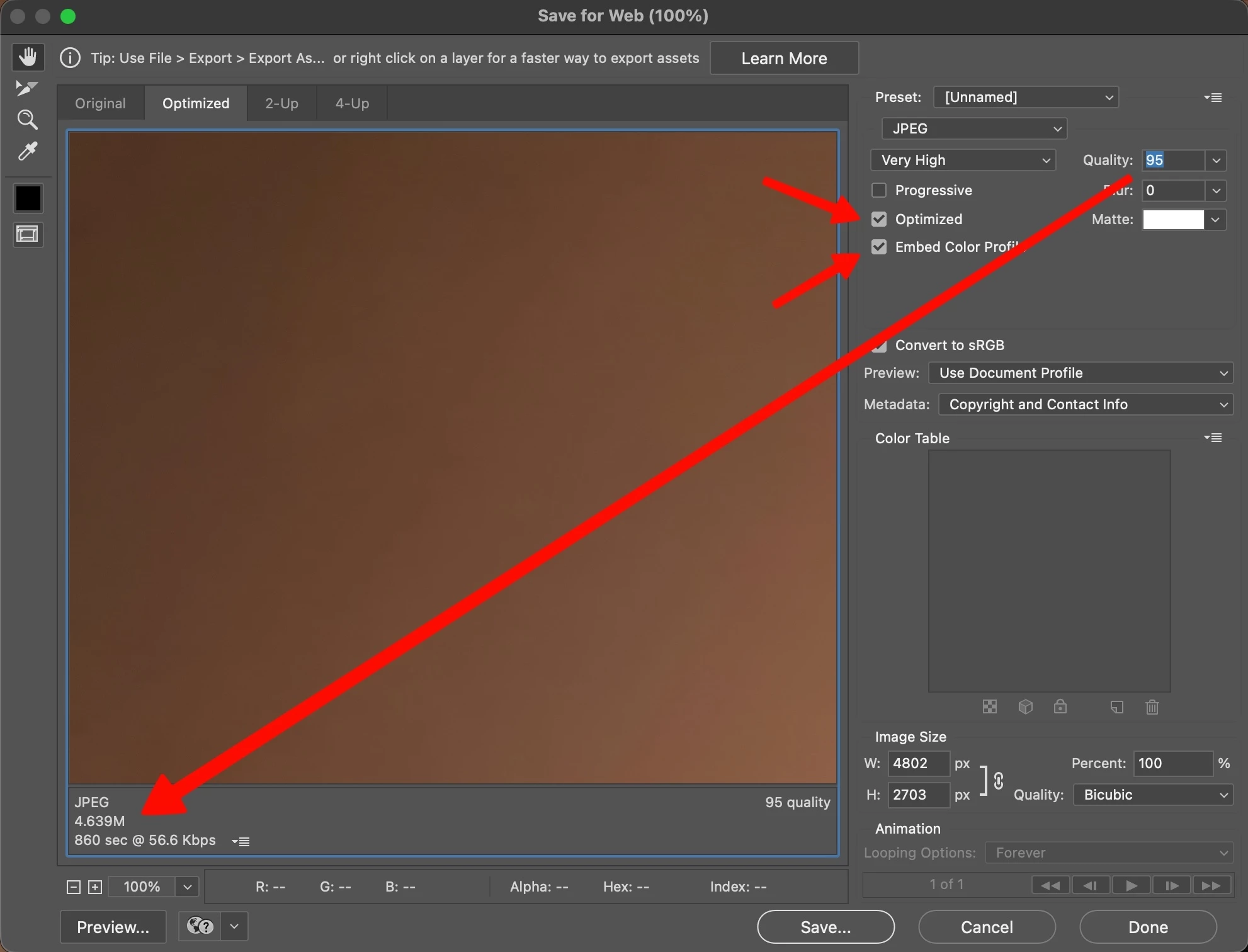 This will give you the following interface. Select JPEG, then check Optimized and Embed Color Profile (which should always be sRGB, by the way, as per Adobe’s requirements), then input the highest Quality number that you can while keeping the result under 5M (lower left corner). You can probably create an Action that will do the bulk of these steps for you.