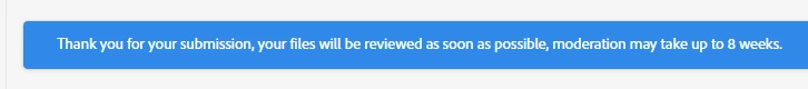 "Thank you for your submission, your files will be reviewed as soon as possible. Moderation may take up to eight weeks." (screenshot attached).