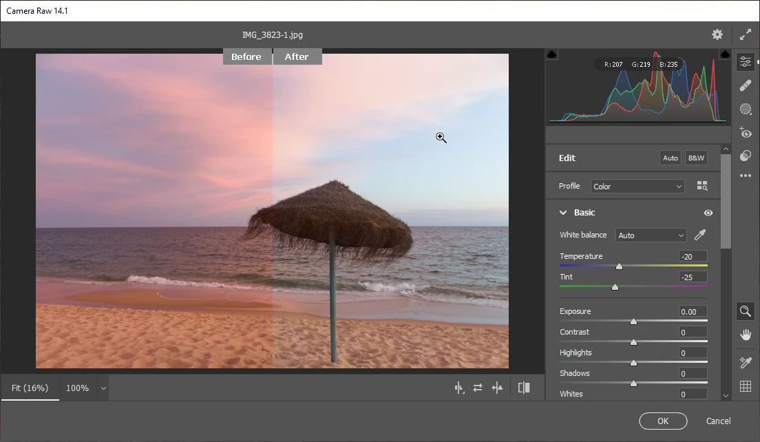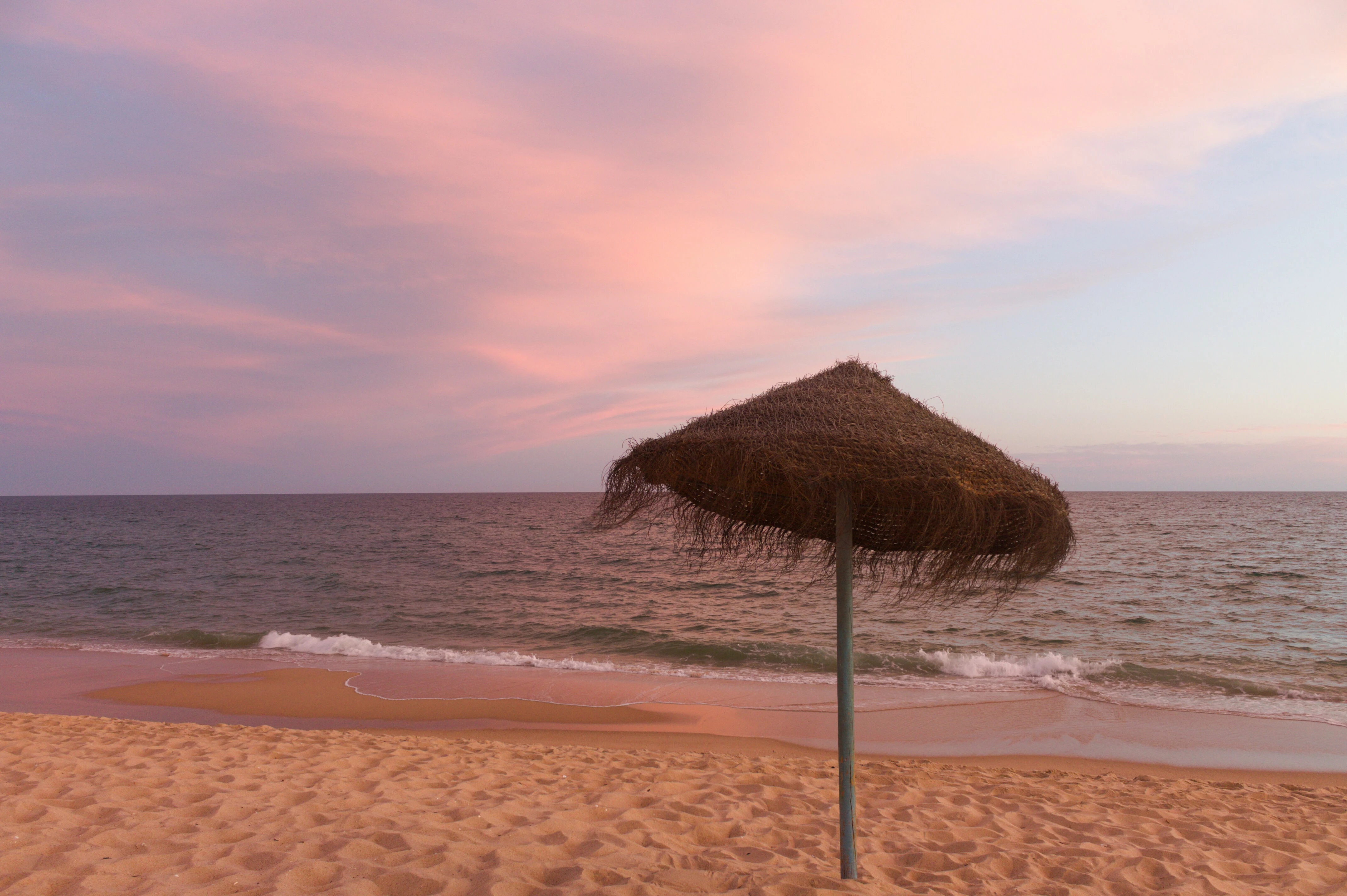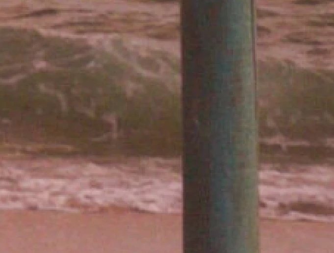 The white balance is off (the photo is too pink.) There is a lot of noise in the photo, especially chromatic (colour) noise. The thatch umbrella could benefit from a little sharpening.