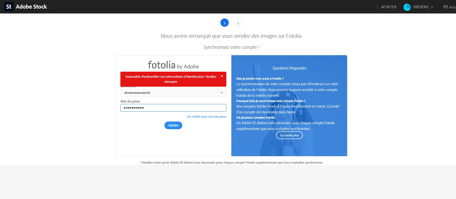 I have an old Fotolia account. Recently we want to sell content on Adobe Stock with my team and when I want to connect to Adobe Stock, Adobe stock say to me that he detecte I have a Fotolia account (two to be precise). I choose an of them, enter my password to associate my old Fotolia account to my Adobe ID and...not working. Error message saying Authentification fail.