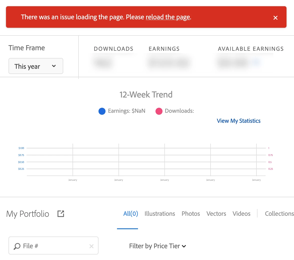 From a few hours my Adobe contributor portfolio homepage shows no report, no earnings, no assets. Just this message: “There was an issue loading the page. Please reload the page.”