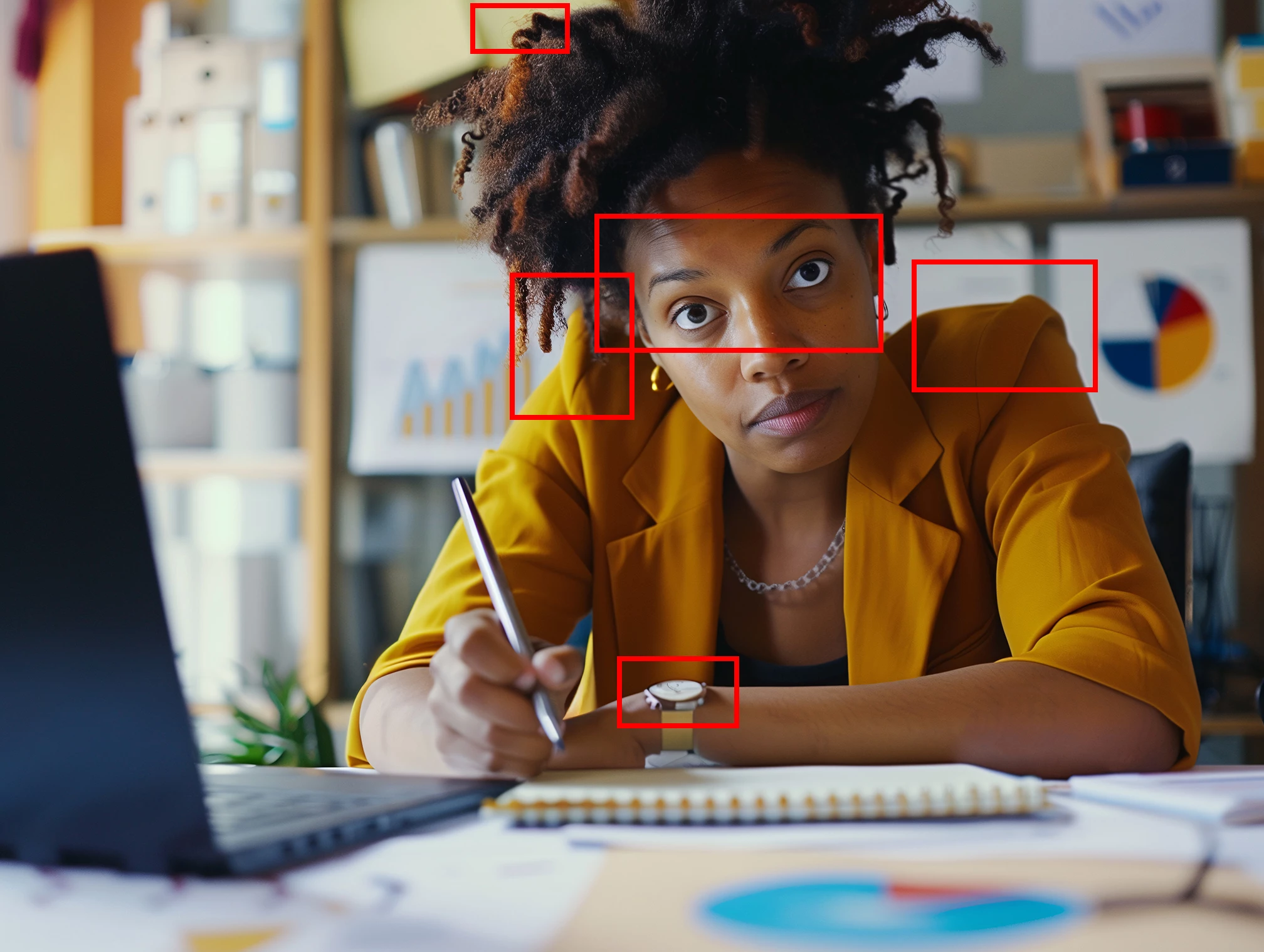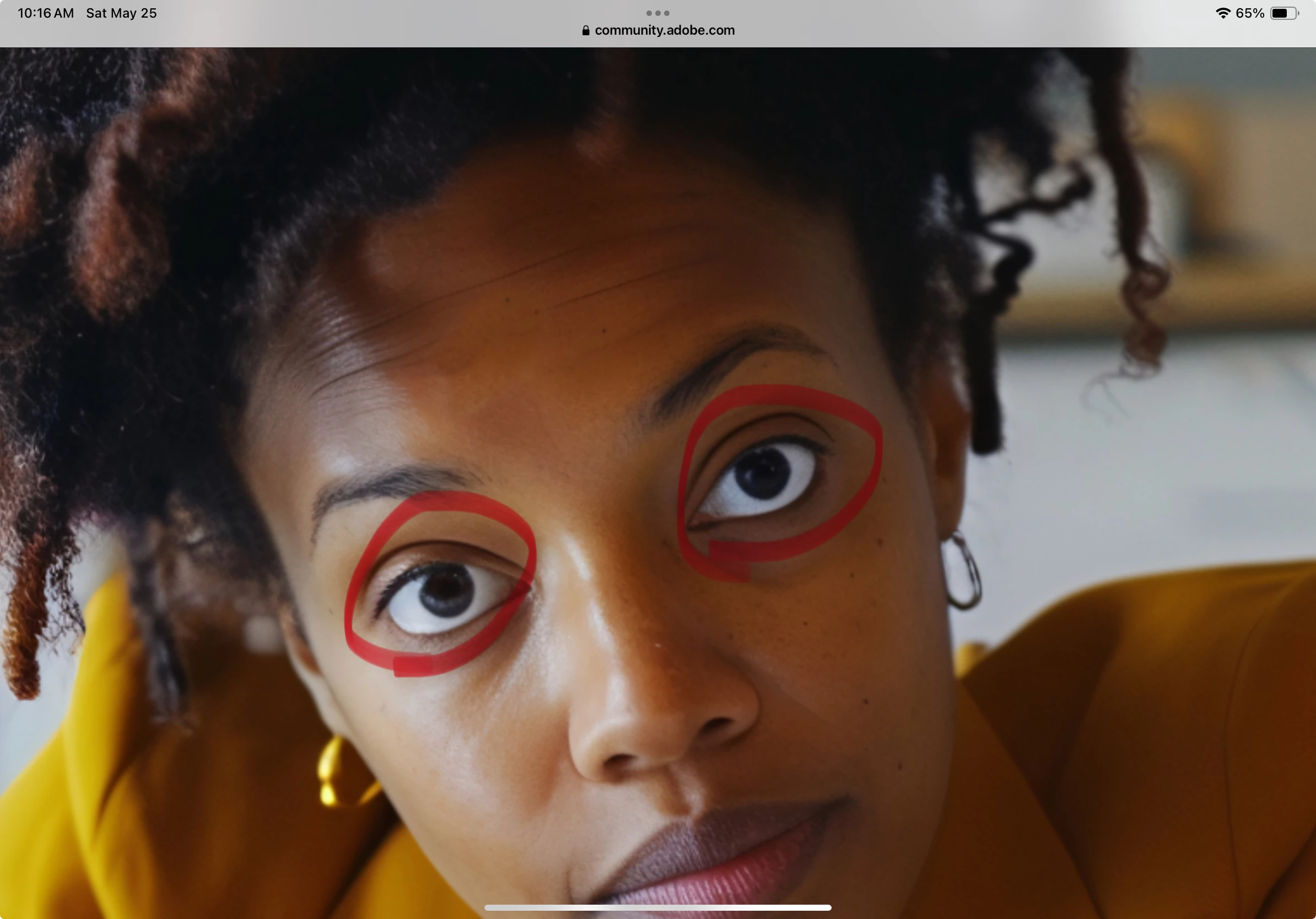 Her irises are messed up, particularly the one on the left. Her shoulder pads are exaggerated. The wristwatch is poorly drawn. Hair could be cleaned up in spots.