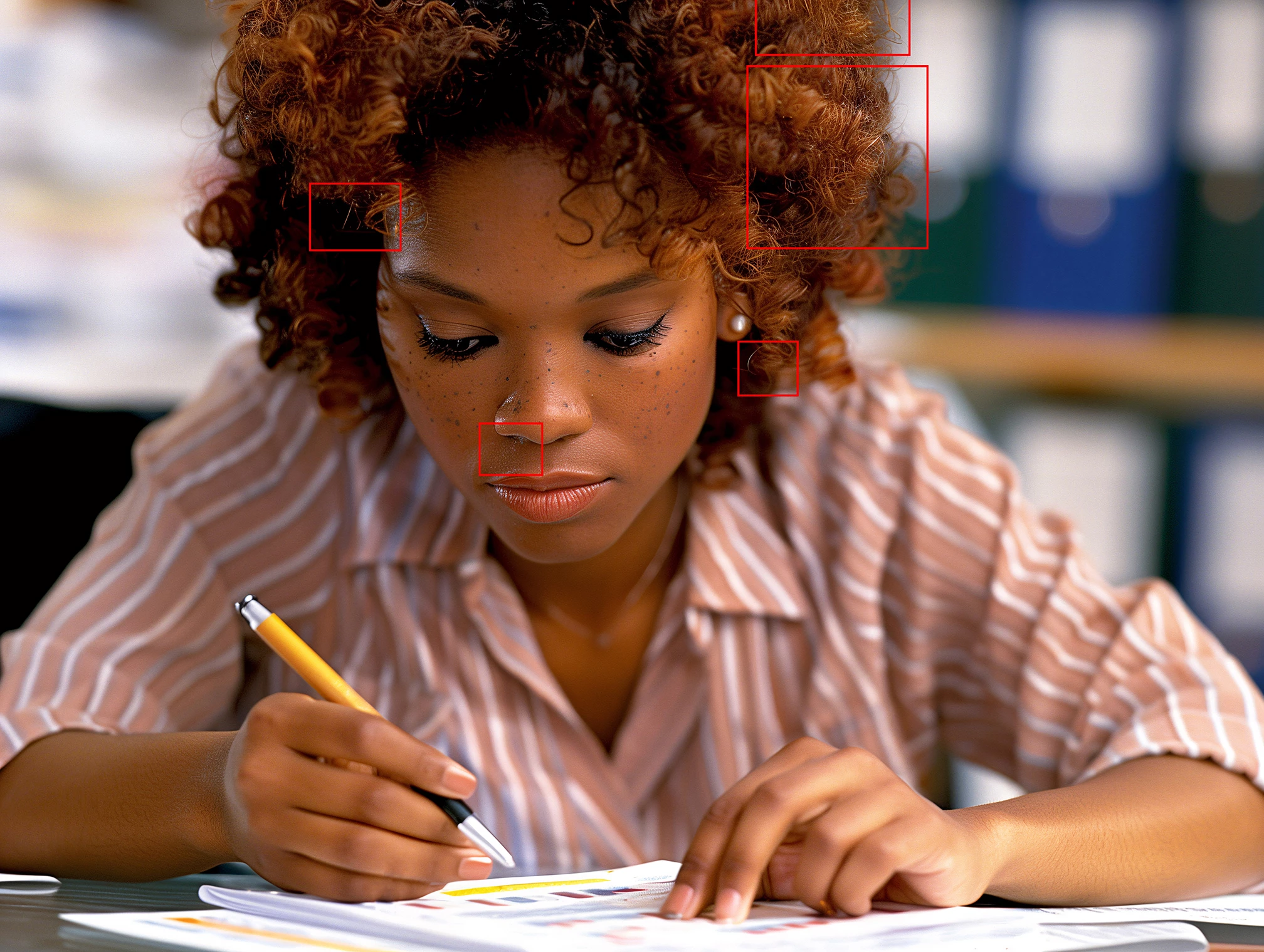 Hair could be cleaned up. Spots under nose. At 100%, her freckles don't look realistic. Eyelashes appear to be over-sharpened. This is the closest of the three, but it only takes one error to get a rejection.