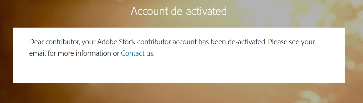 <p>Today was my first withdrawal first date of 41 USD but suddenyl i got this mail from adobe stock, "We are writing to let you know that your Adobe Stock contributor account has been deactivated for suspicious activity. For more information"<br /><br />Although never done that i was just focusing on uploading the content on my account. Please help me.</p>