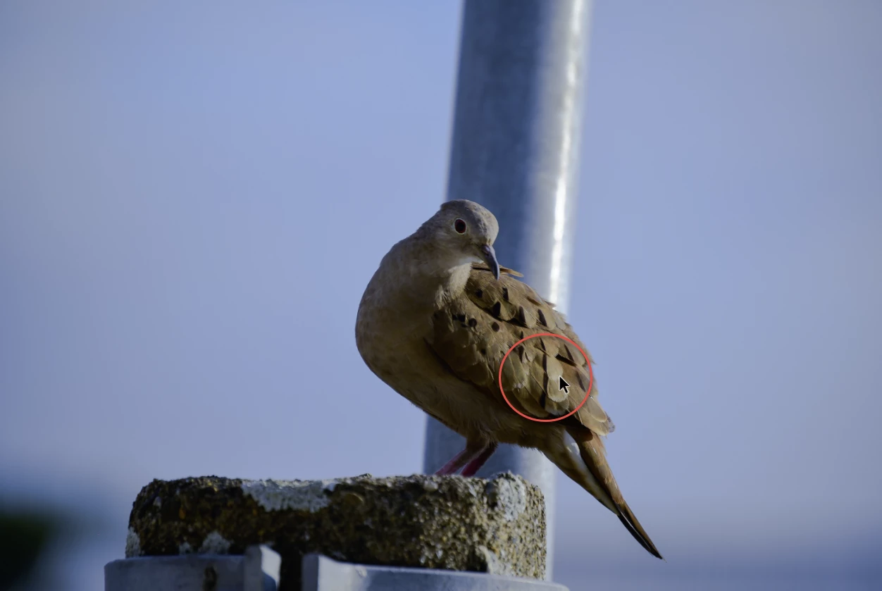 3- Los animales y las personas se deben enfocar en los ojos al hacer la fotografía, puede que esa hubiera sido la intención , pero el foco se fué a las plumas. Es posible que al utilizar una lente zoom a pulso, se te hubiera movido un poco el punto de enfoque y fué a parar a las plumas.