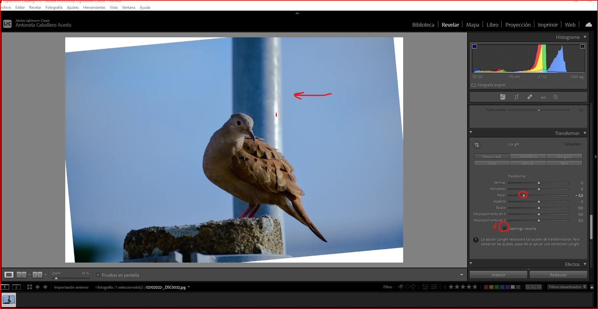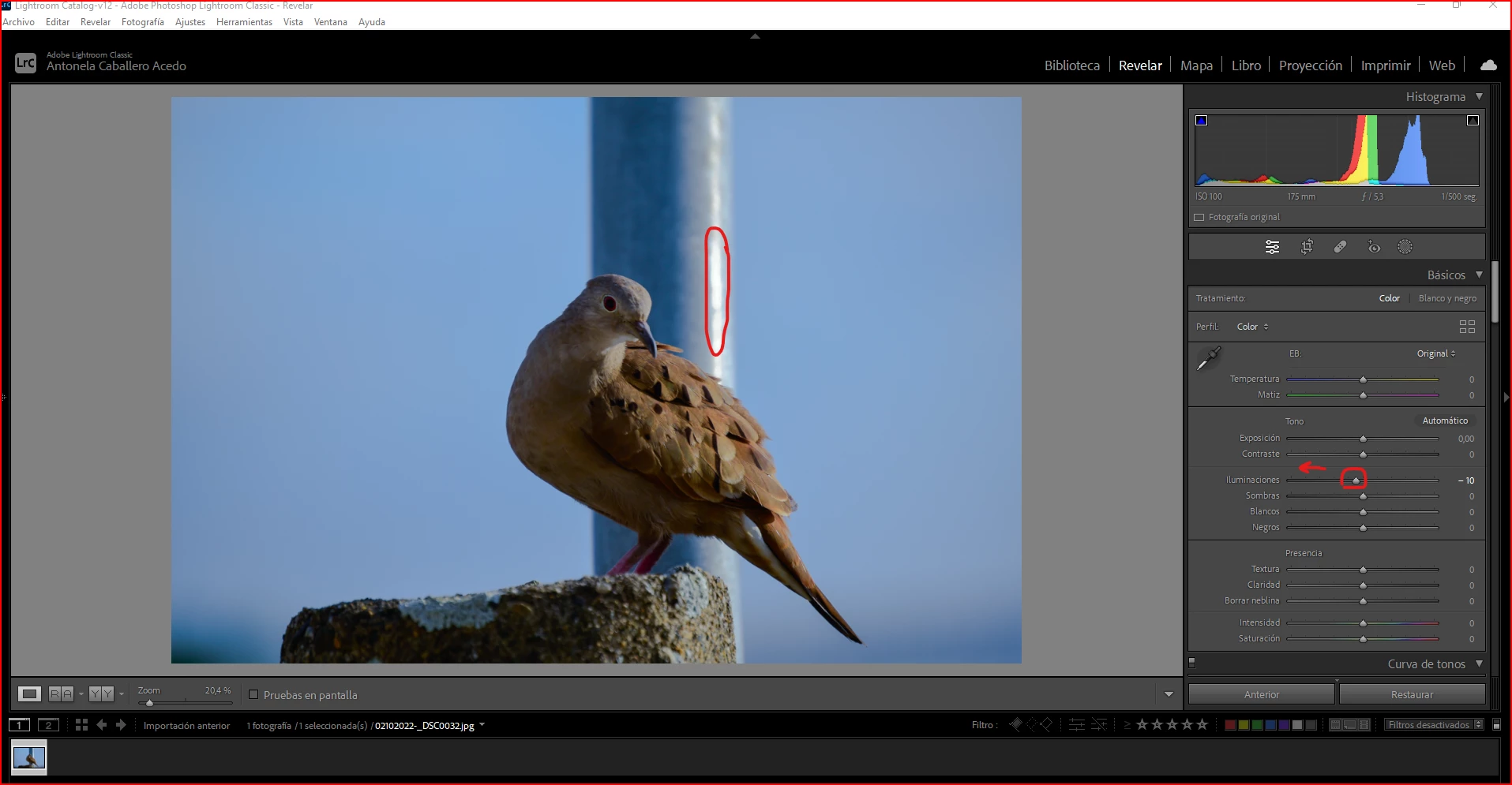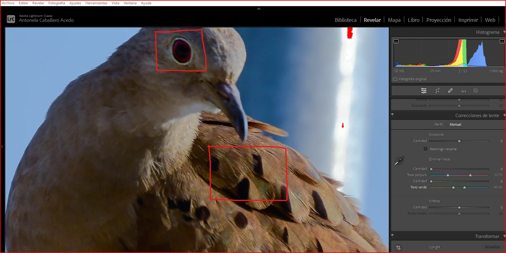 2- Hay halos en el pecho del ave. Esto es un borde azulado en el contorno. También se puede solucionar con Lightroom, en el bloque CORRECCIONES DE LENTE, clicar en Perfil los dos valores y en Manual clicar en el gotero e ir a buscar la parte azul del borde a corregir y volver a clicar. Al pasar sobre el borde el gotero cambiará a color morado, entonces clicas y se corrige.