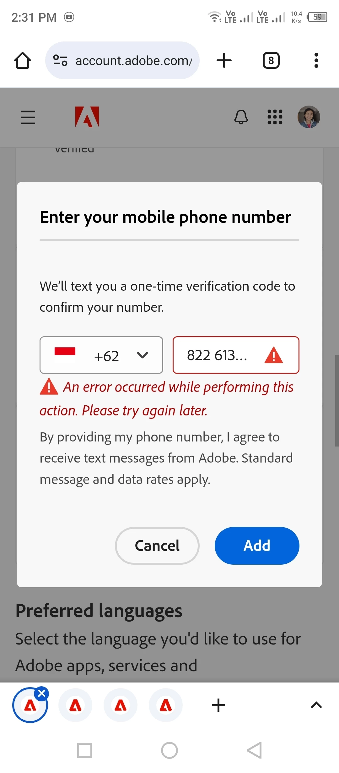 Does anyone know on how to fix a problem when adding a phone number on the account setting? I've tried to add my phone number but it keeps error for unknown reason. It said "An error occurred while performing this action. Please try again later".