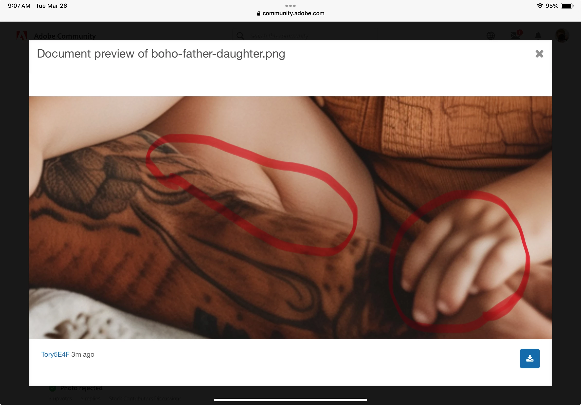 The image seems rather blurry. Some of the hair on his head isn't attached to his head. The girl's hand is malformed. His forearm hair doesn't blend properly with the tattoo. File format PNG should not be uploaded unless the image has a transparent background.