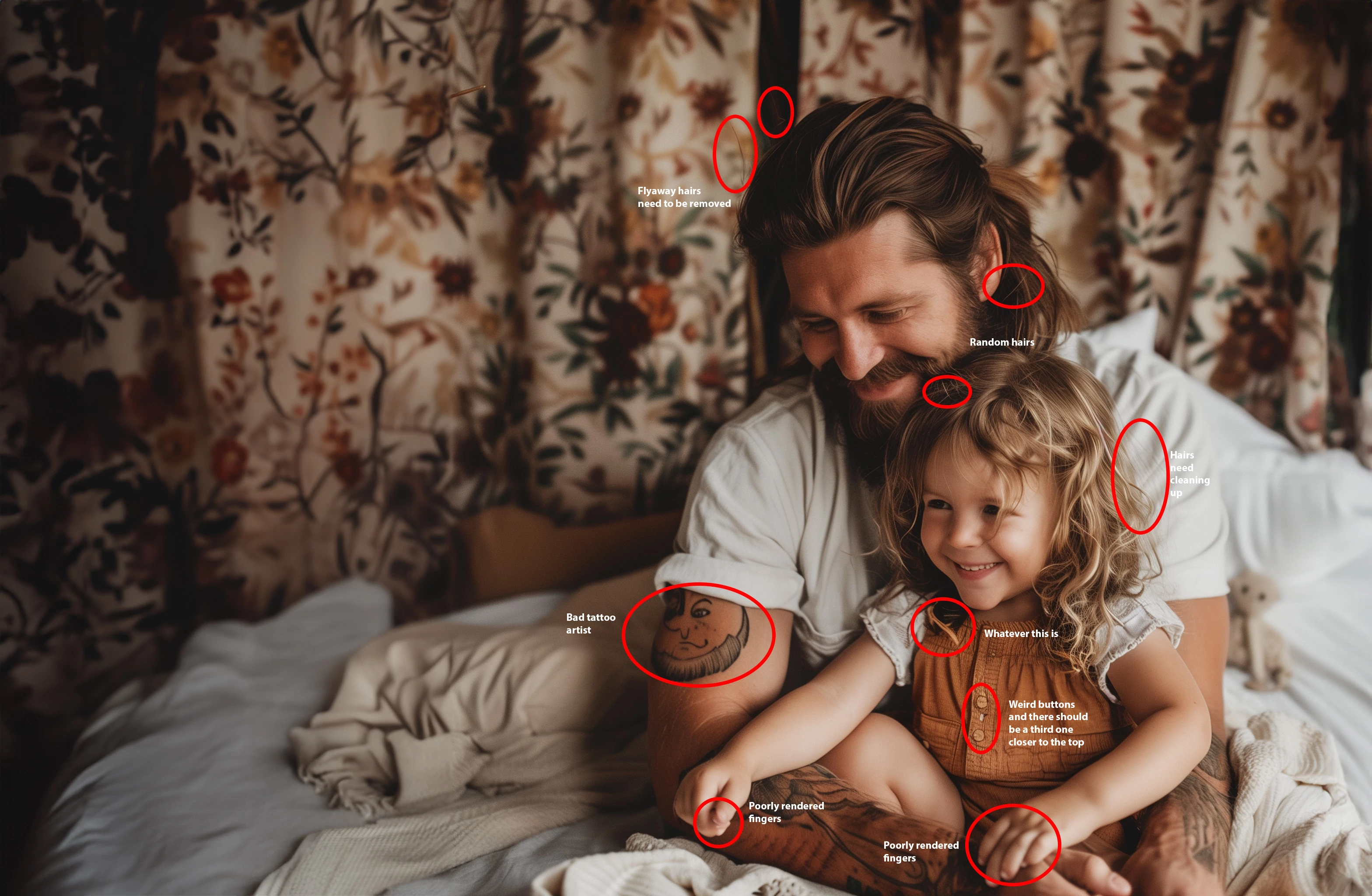 (It looks, to me, that the AI wants to hide the hair behind the cushion).