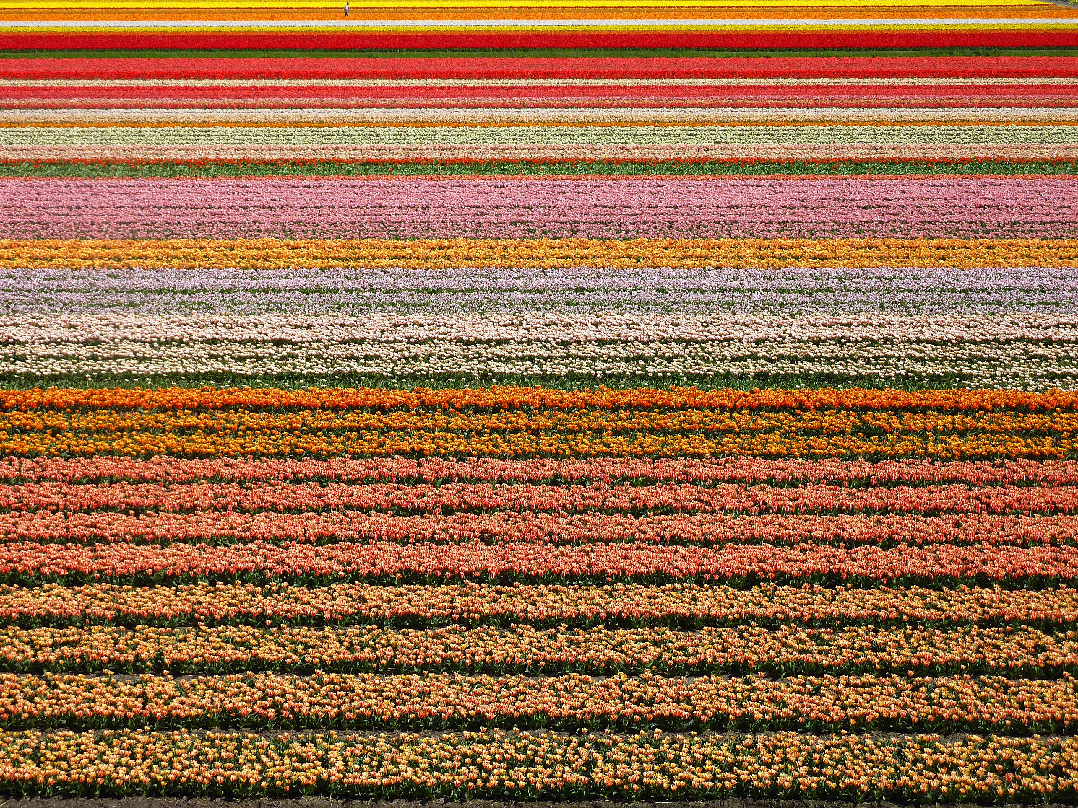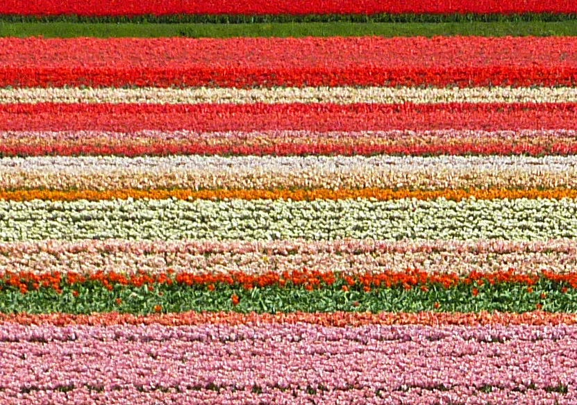 On the rows of tulips, zooming in to 100% reveals that the flowers are just blobs of color with no detail.