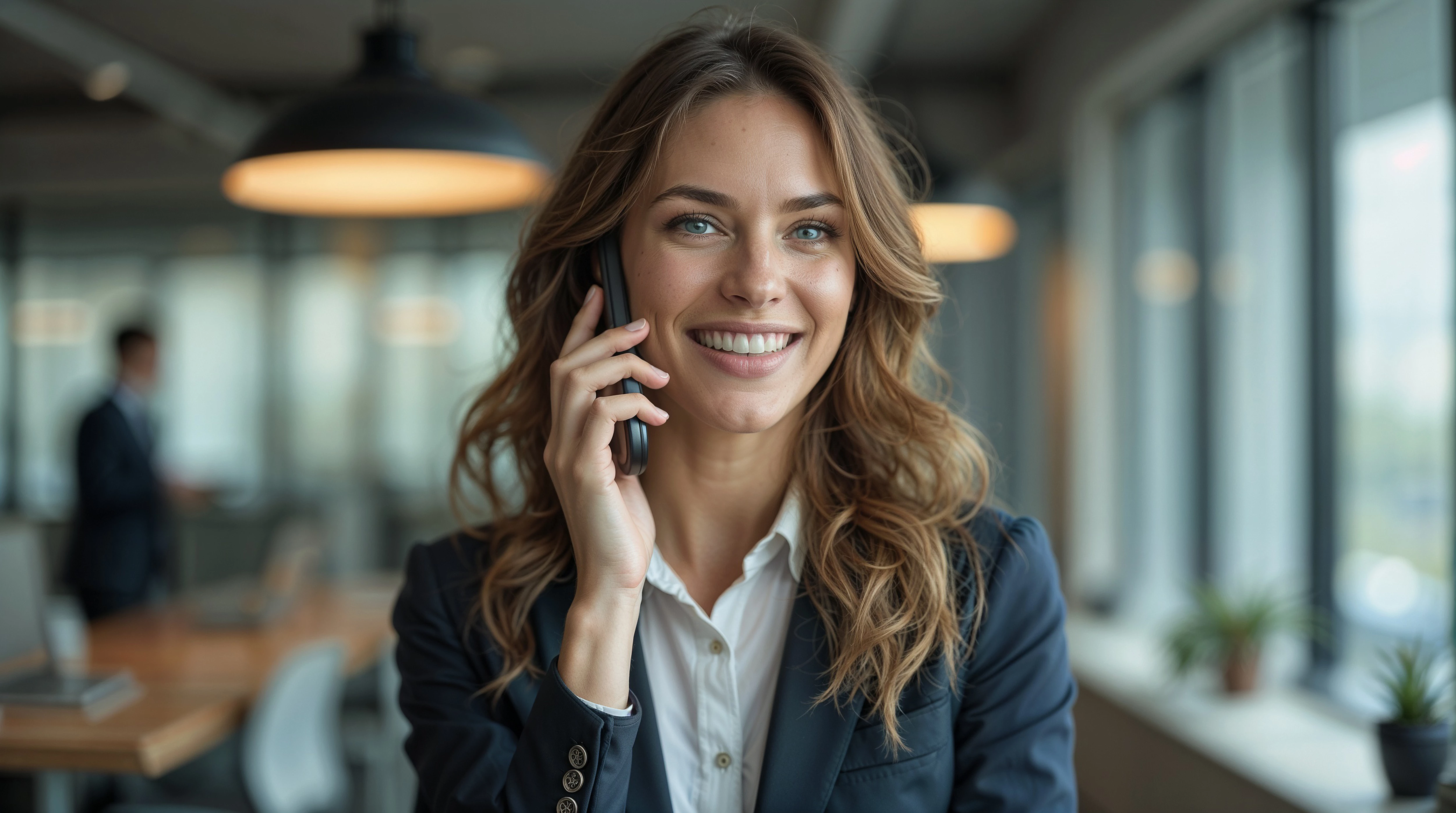 Woman; Phone; Smile; Office; Business; Professional; Call; Conversation; Blonde; Suit; Confidence; Communication; Work; Modern; Corporate; Focus; Engagement; Technology; Happiness; Team