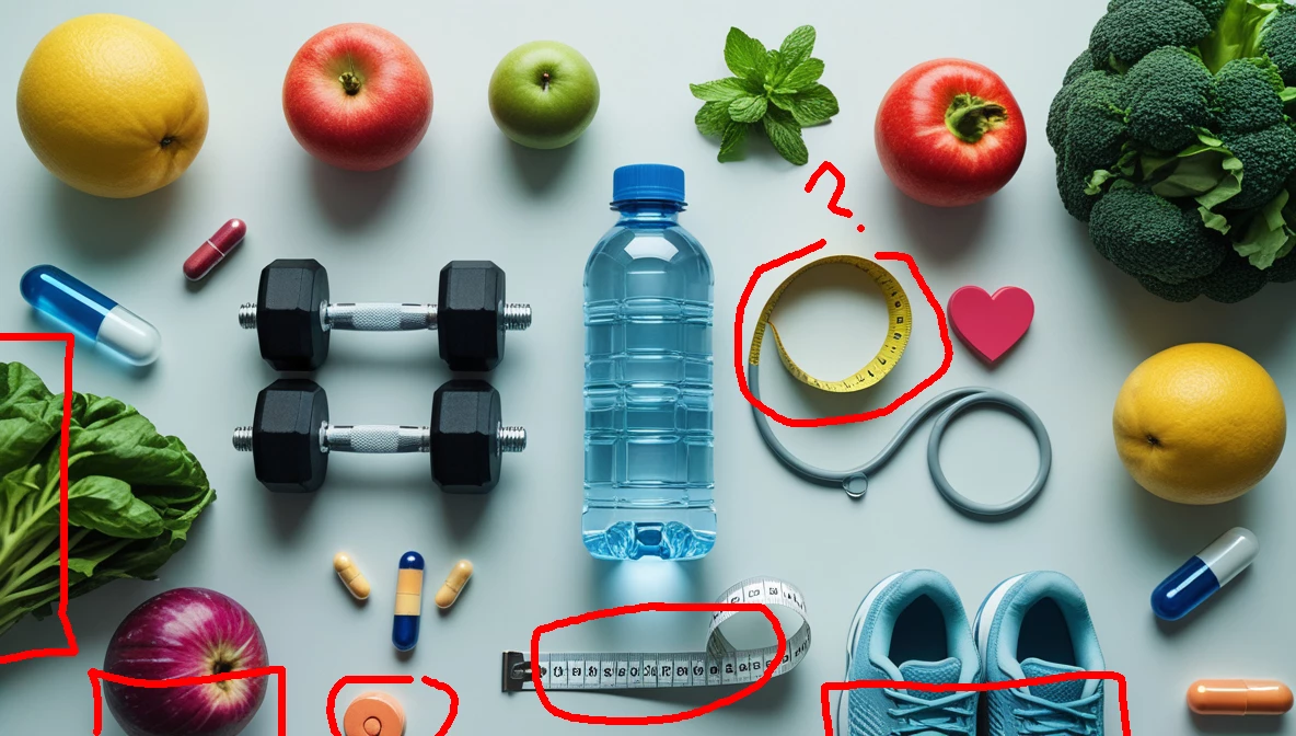 A modern flat-lay or conceptual composition representing a healthy lifestyle — fresh fruits and vegetables, a bottle of water, dumbbells, running shoes, a measuring tape, and medicine capsules arranged harmoniously on a clean background. Emphasize balance between diet, exercise, and healthcare. Soft natural lighting, vibrant colors, and a minimalist aesthetic. Include symbolic elements of wellness like a heart icon, ECG line, or stethoscope. Perfect for health promotion, wellness blogs, or medical fitness campaigns.