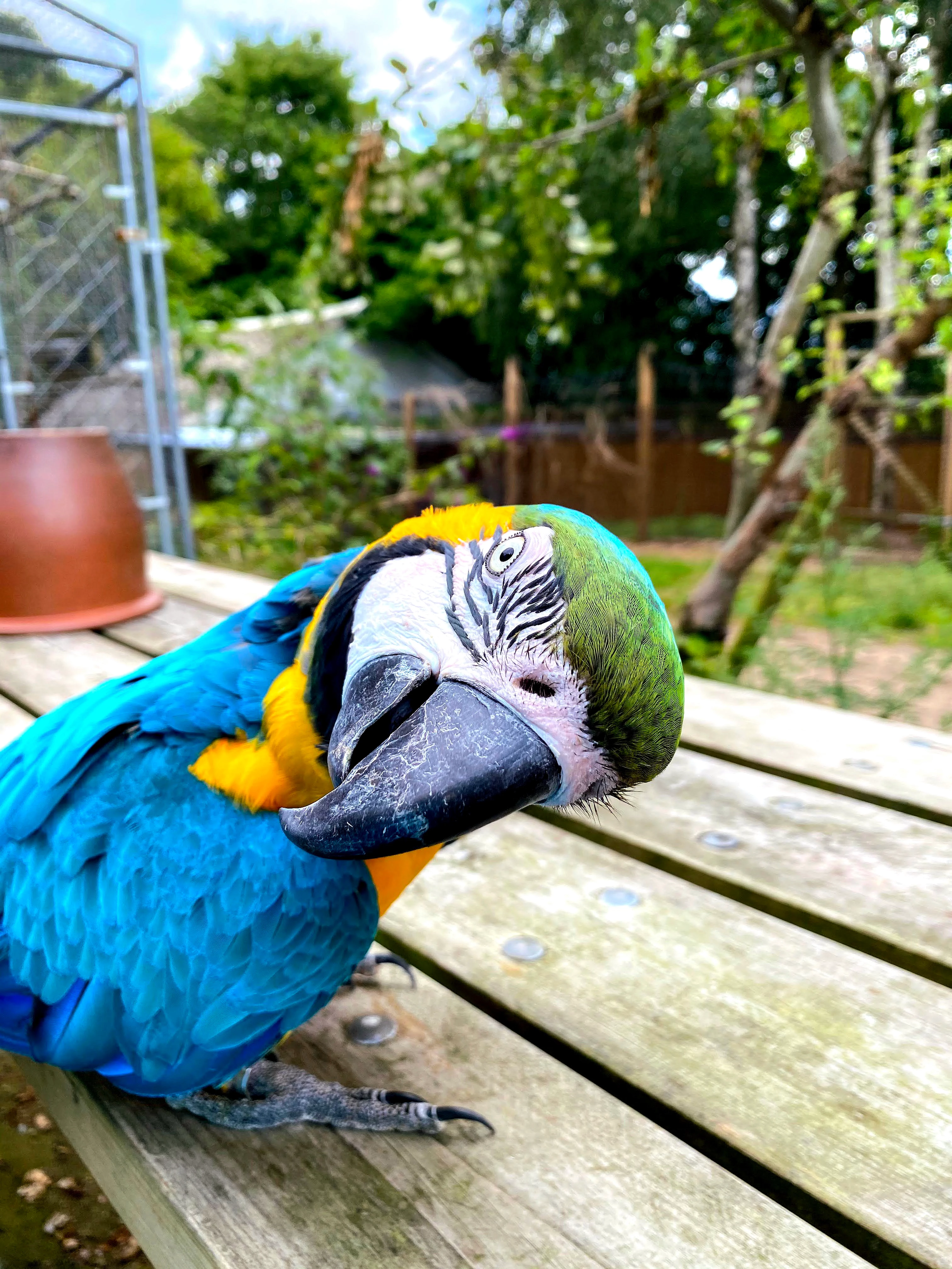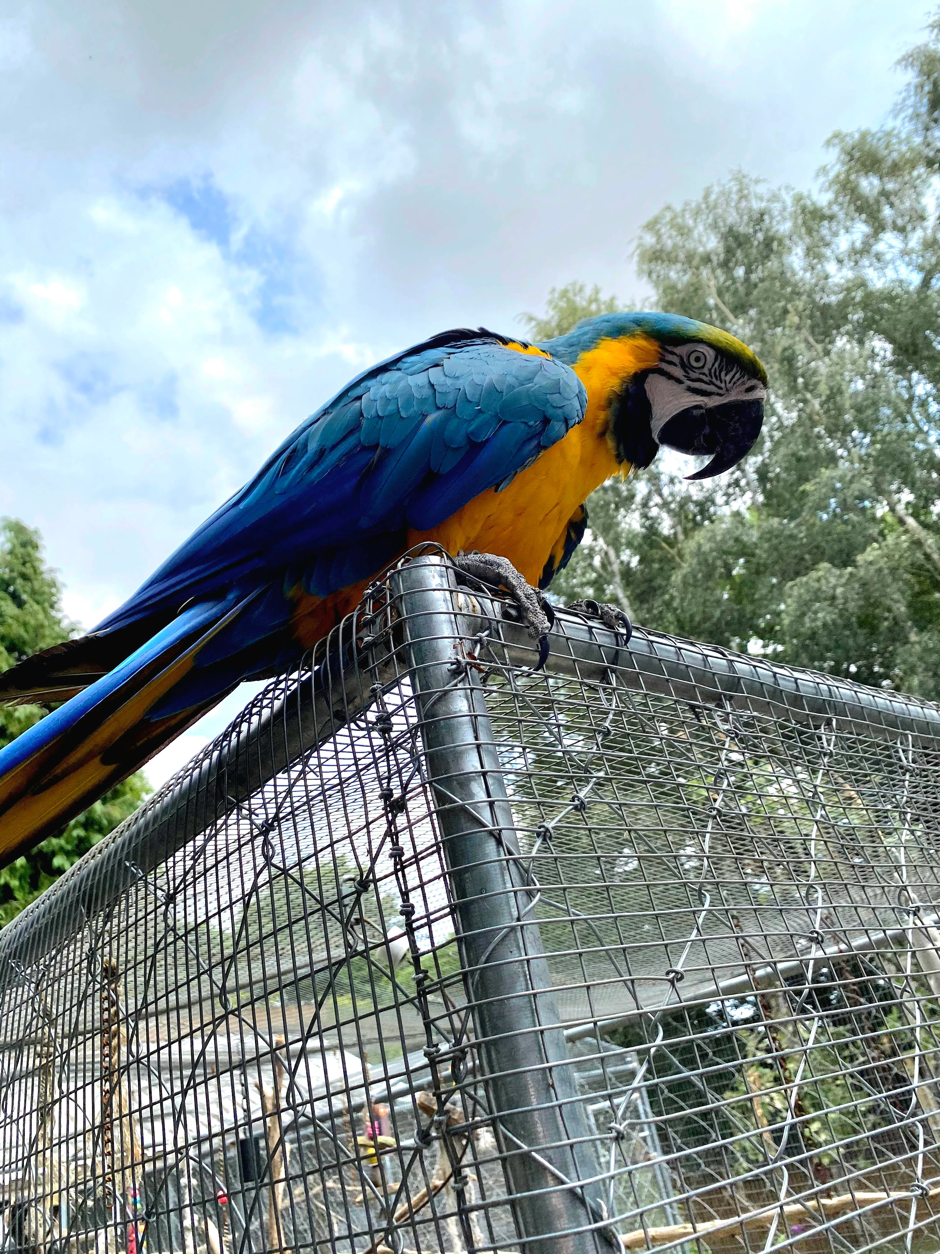 macaw blue yellow bird aviary.jpg - composition issue. You've cut off his tail. Also the sky has artifacts