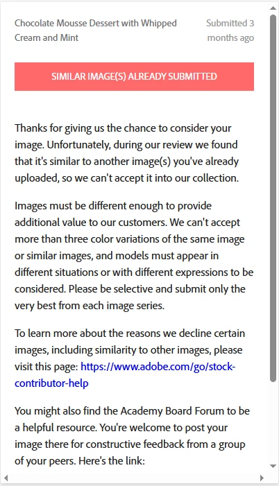 Hi, Assalamualaikum to all brothers and sisters. These days, many of my files are getting rejected on Adobe Stock, and I keep getting the same reason: "Similar Image(s) Already Submitted."