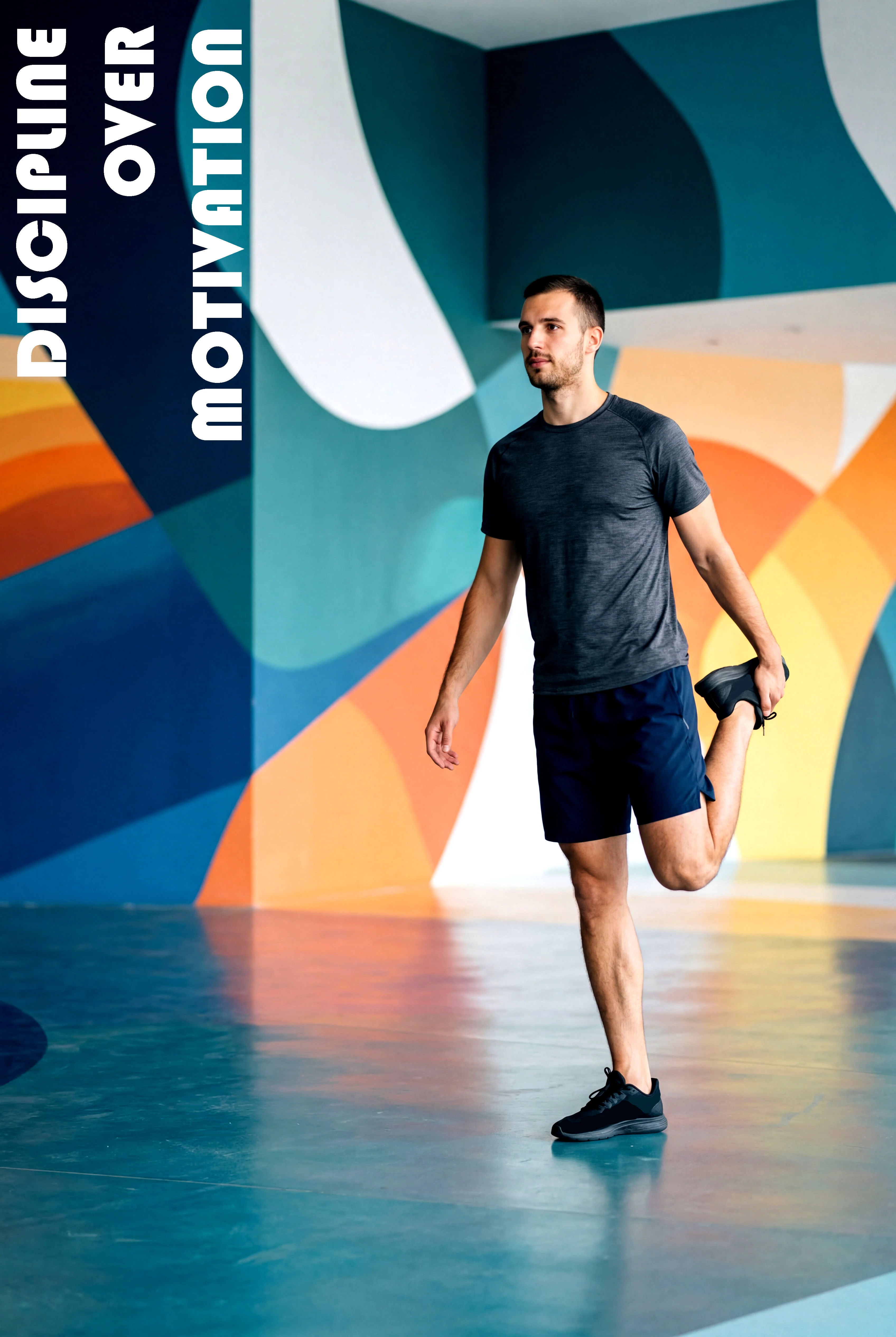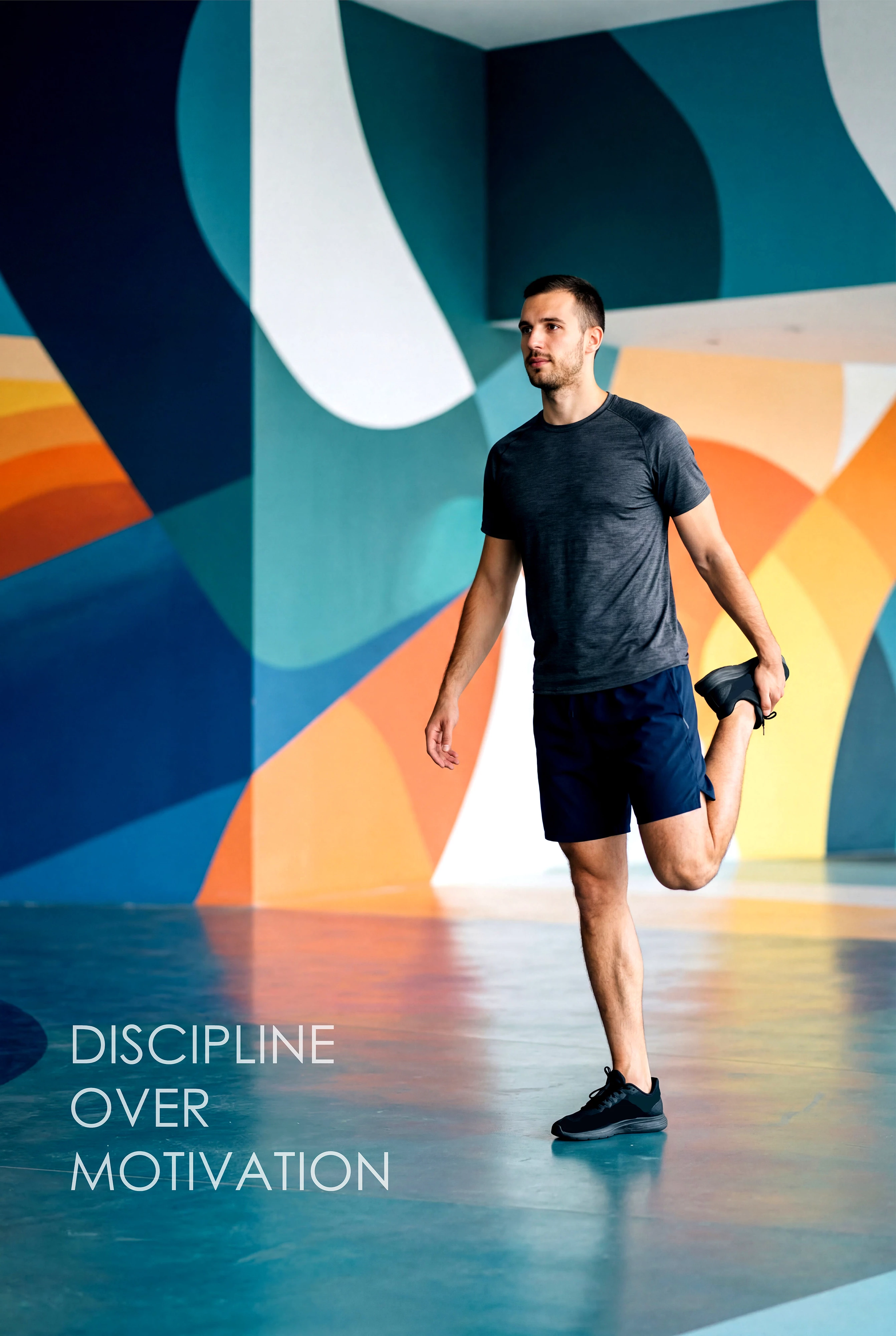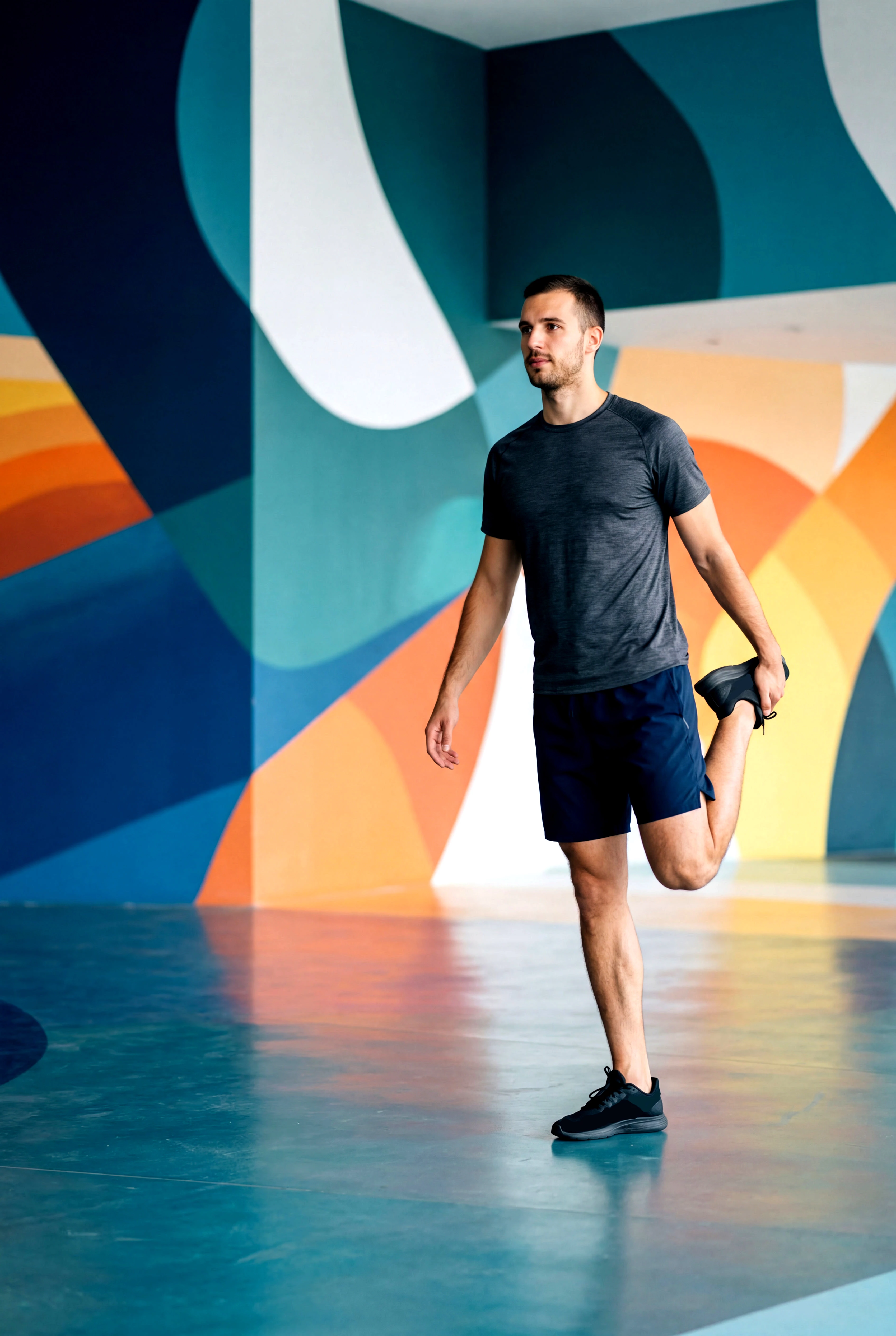 Man Stretching wearing a blue shirt