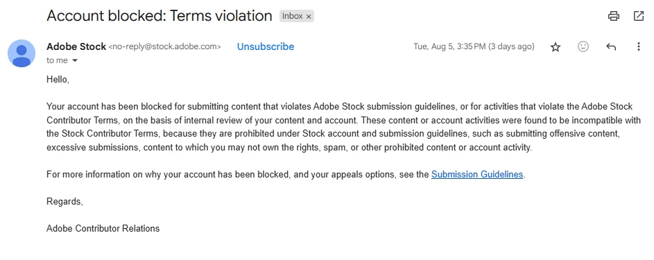 I recently received a notice that my Adobe Stock contributor account has been blocked due to a terms violation. I would like to understand what specific issues led to the block and what steps I can take to appeal or reinstate my account. Could you please guide me on how to resolve this matter and regain access to my account?
