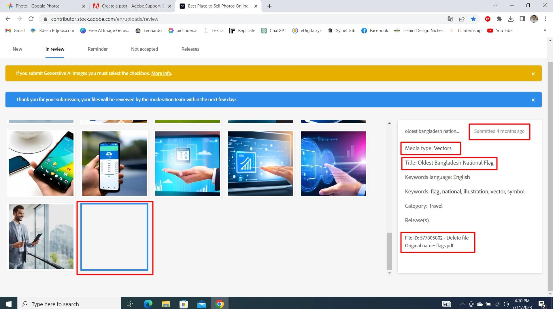 I submitted a pdf content on Adobe Stock 4 months ago and right now it is still pending review by Adobe Stock since I submit that. It does not yet show anything positive output after I submit that content. It also does not show any preview but only shows pending. So can anyone give me some support to solve this problem so that I can delete this file from my adobe stock contributor account?
