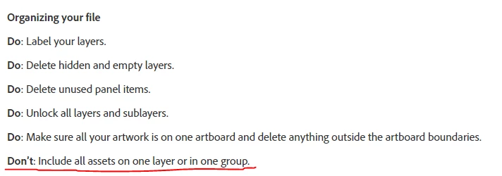 So I mostly work with vector files and checked the "Vector Requirements" on Adobe Stock Contributor. So in the requirement under the "Organizing your layer" section, they mentioned, "Don't include all assets on one layer or in one group". I attached the Screenshot. So I want to know are they talking about Layers or Sub-Layers?