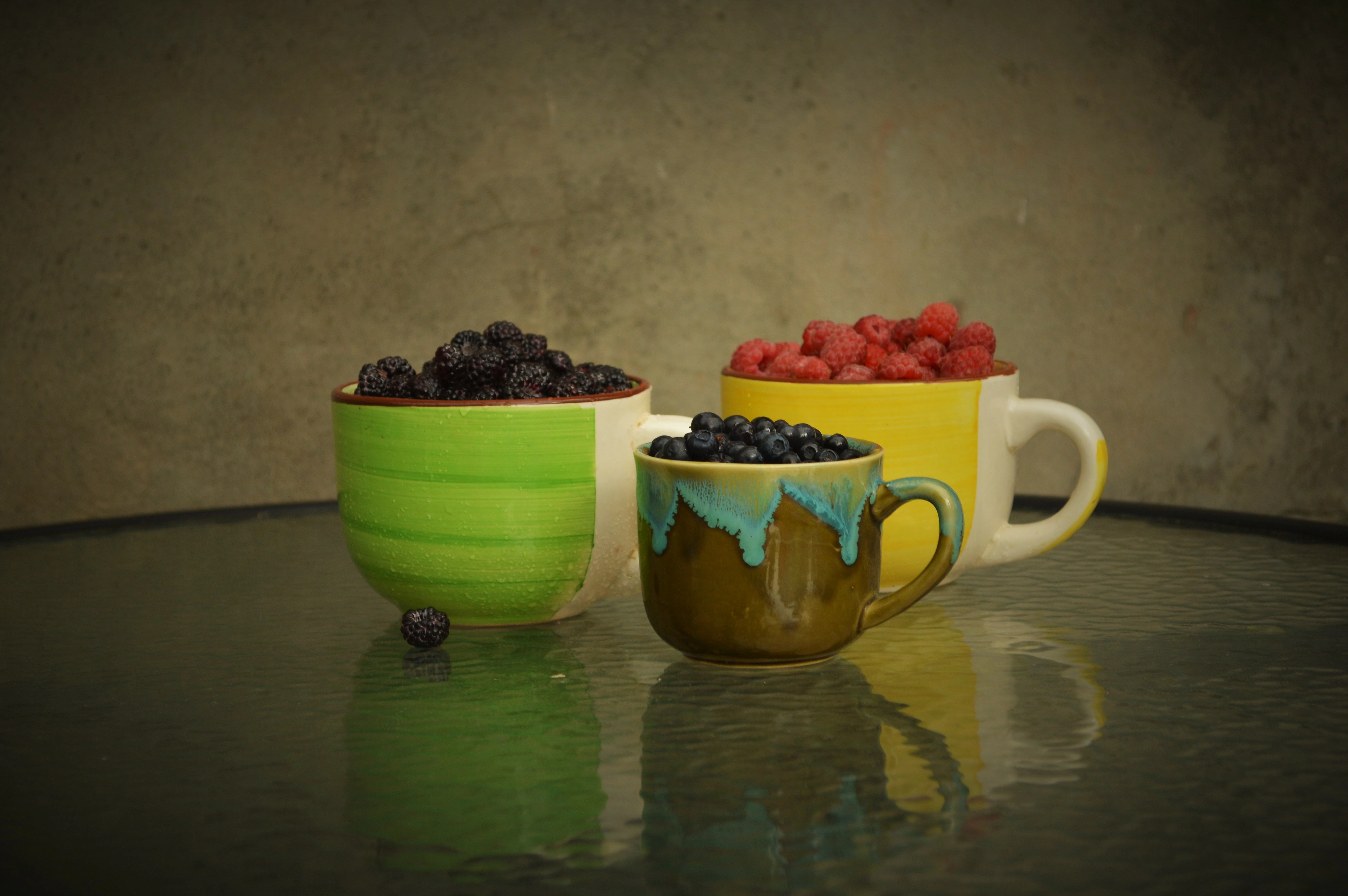 Dear Yana Bjorn, To my eyes, the best of these presented photographs are the single flower and the cups filled with fruit. Each one contains other errors or distractions which can be seen if you examine them at 100 -200% enlargement. They are blurs and noise and spots and white balance problems.