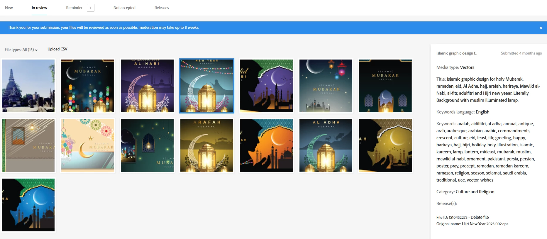I am a contributor at Adobe Stock but i have some troble about my Isamic vector files that i had submited since more than 5 months ago and they are still waiting for review to nowaday . How should i do about the submitted files? or resubmit again?