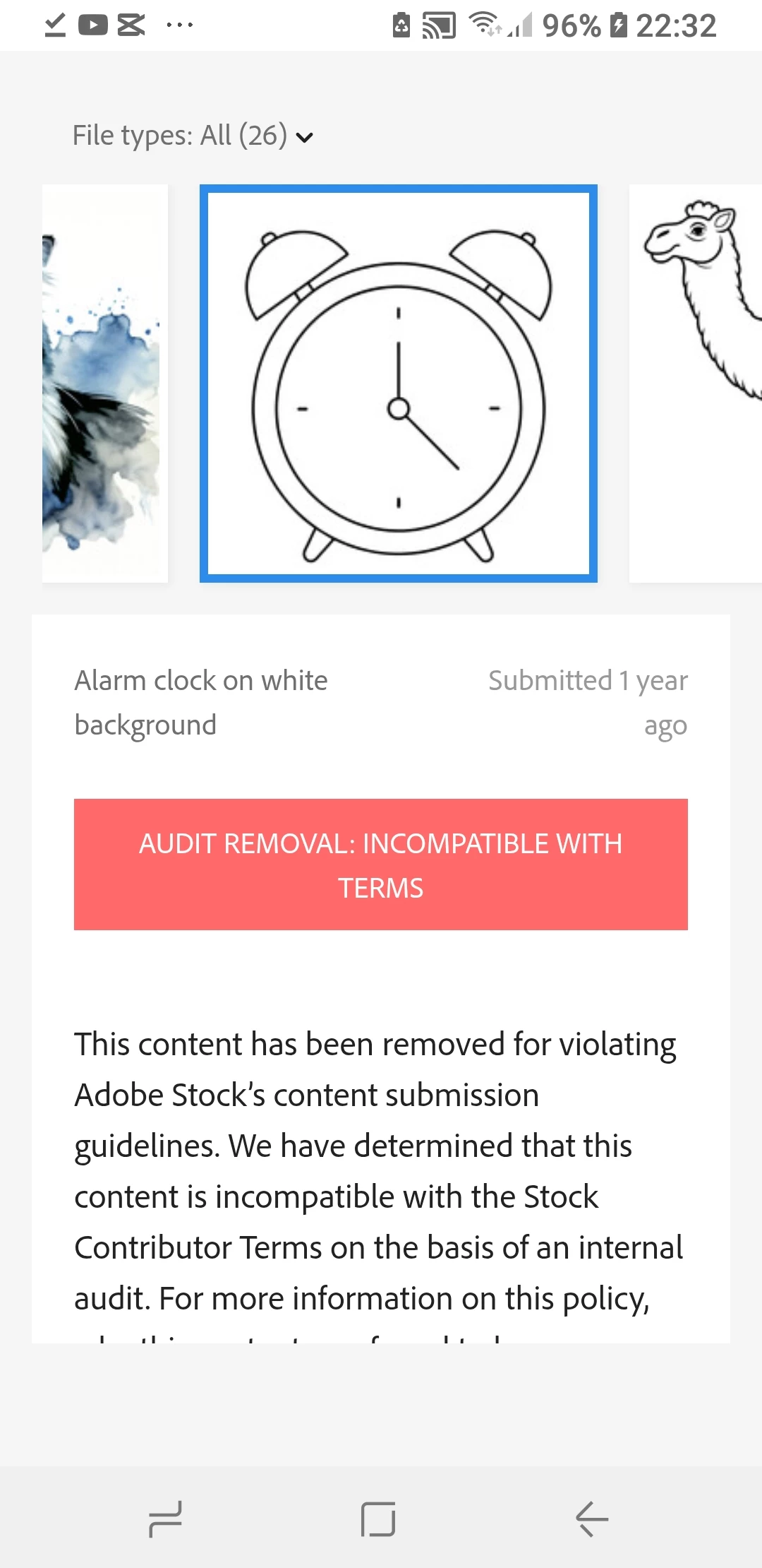 MMarcio281503814pgiParticipating FrequentlyForum|Forum|11 months agoMay 11, 2025QuestionImage removedForum|Forum|11 months agoMay 11, 20252 replies207 viewsI received an email from Adobe Stock informing me that an image of mine was removed without mentioning the reason. But the image is still in my portfolio. What should I do, delete the image, contact Adobe Stock or do nothing about it?Contributors