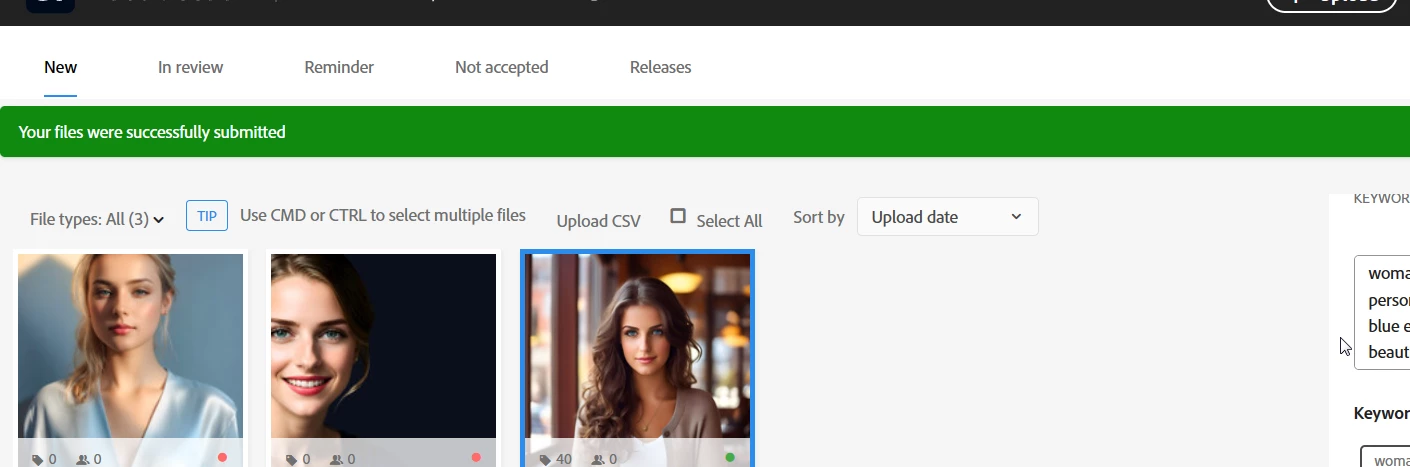 there have been a problem with the uploading process that i would like to report. it has been happening for few days. the Files doesn't seem to Submit, even though the message says (your files were succefully submitted) and i have everything written (tags, title..etc) so it's ready with the little green dot ( i have attached a screenshot)