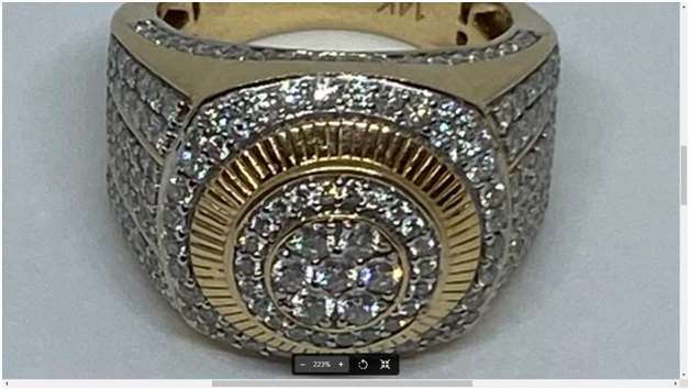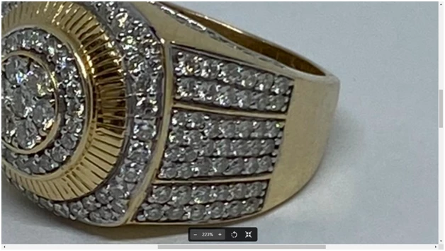 The images are not well lit, resulting in blown-out highlights and dark, shadowy areas. The DOF is too shallow, resulting in fuzzy edges and a very limited in-focus area. The background, as a result of being underexposed, is also noisy and grainy. Search for "gold diamond ring" in Adobe Stock and you will see many examples of rings beautifully lit with bright white backgrounds.