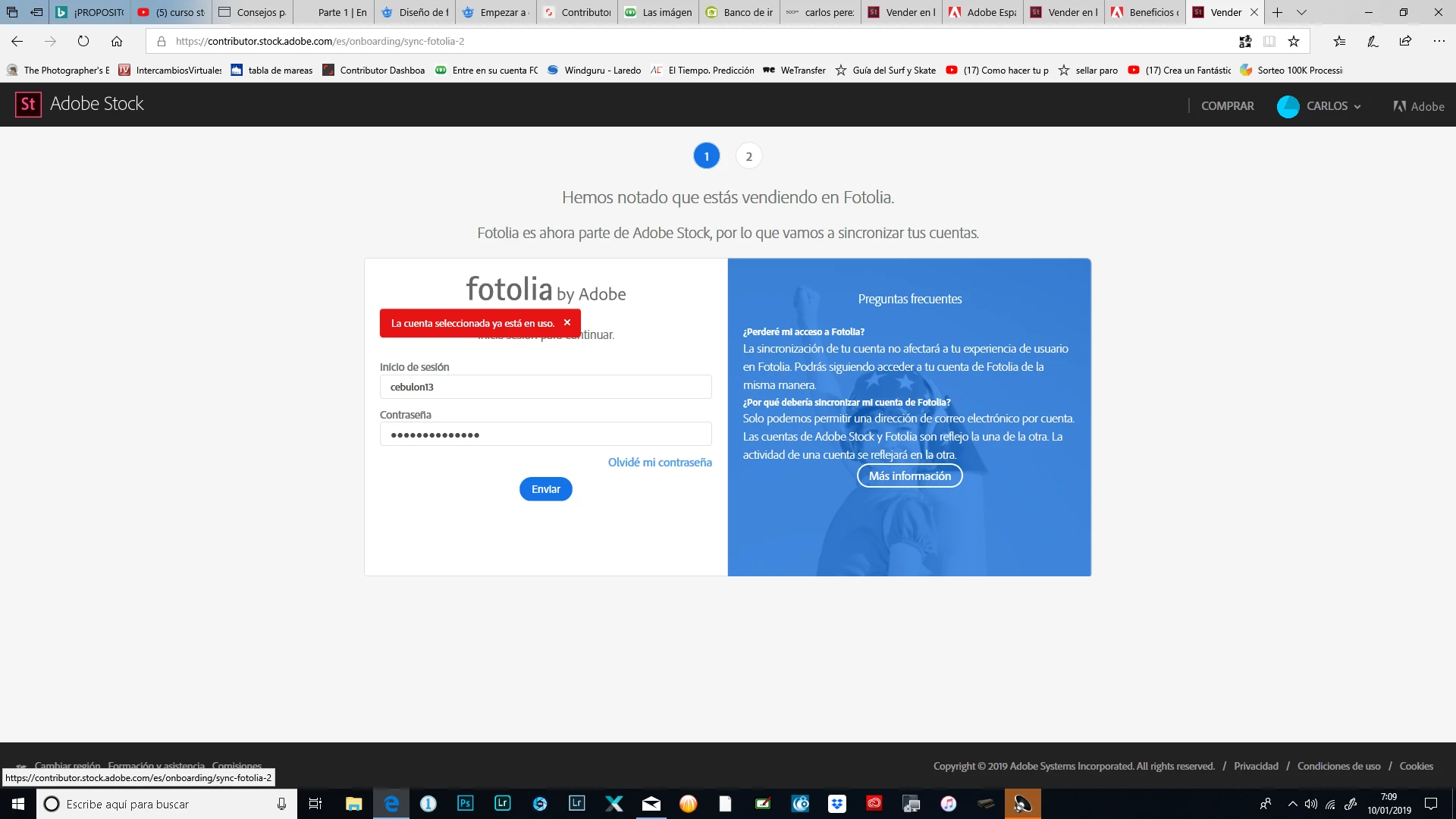 no me deja entrar en mi cuenta de adobe stock, me sale esta pantalla y el mensaje en rojo dice que esa cuenta esta en uso (claro es la mia) El caso es que antes podía entrar en mi cuenta de colaborador de adobe stock y ahora no hay manera. Que puedo hacer?, a alguien mas le ha pasado.