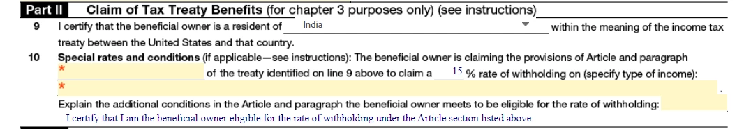 I am from India and I want to inquire about the W-8BEN tax form which i am not able to find details to fill for "Part 2" Claiming Tax Treaty Benefits. I am not able to fill all the three details required in point 10 and it is highlighted also. Please help.