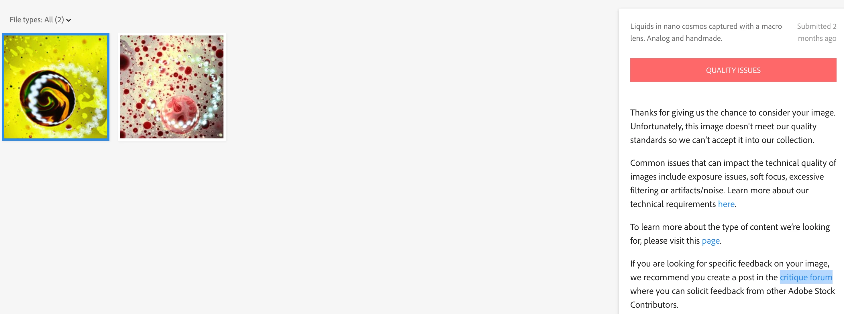 Am having photos rejected and message suggests I post on the critique forum. Just want to make sure this is the right place. Photos are meant to have very small dots so I'm thinking it might be a Adobe's AI's mistake if not seen by a human??