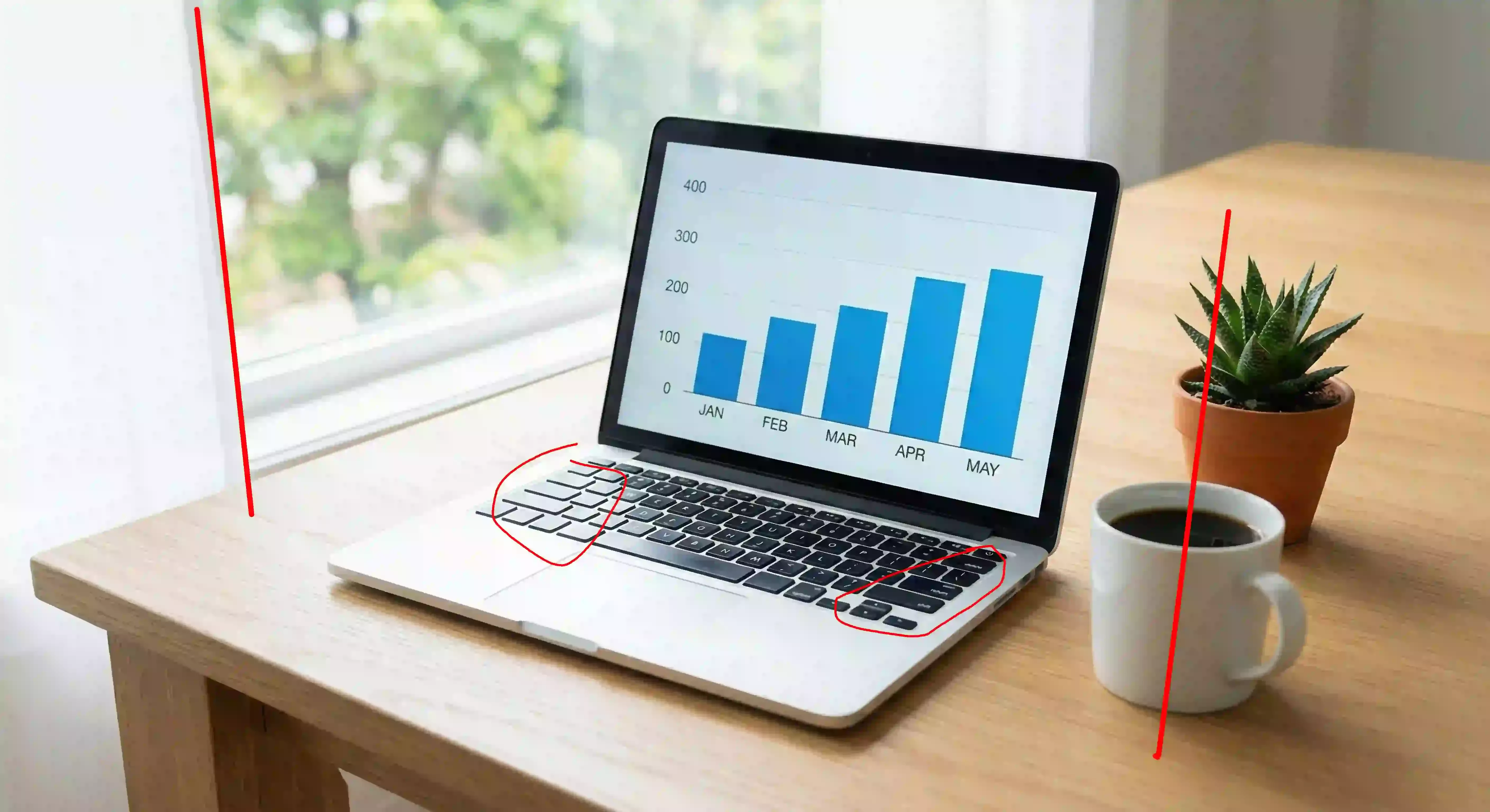 Slanted verticals, loss of detail on some keys, burned out highlights.