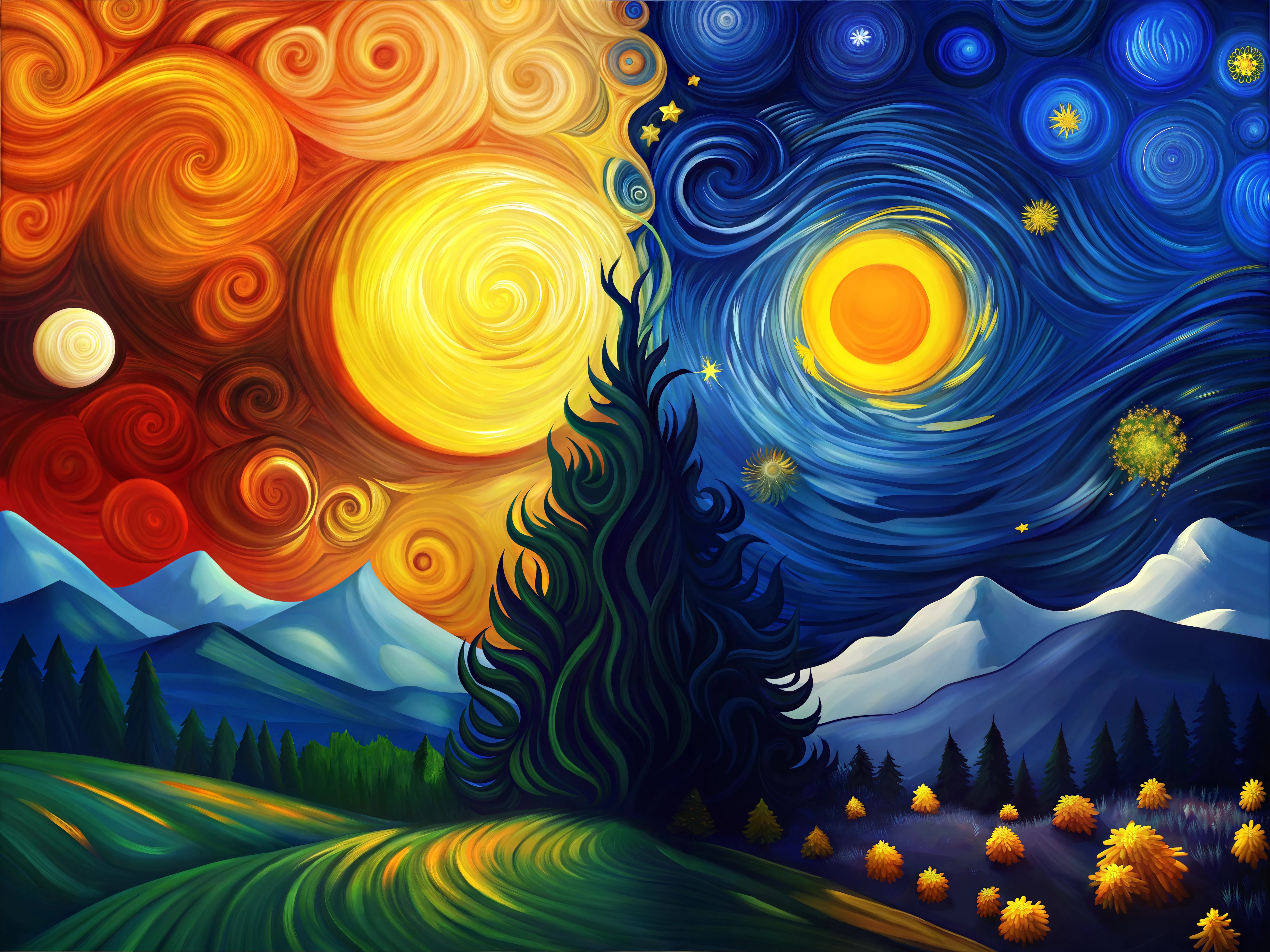 beautiful abstract bright illustration of sun and moon inspired by famous impressionist art, day night concept