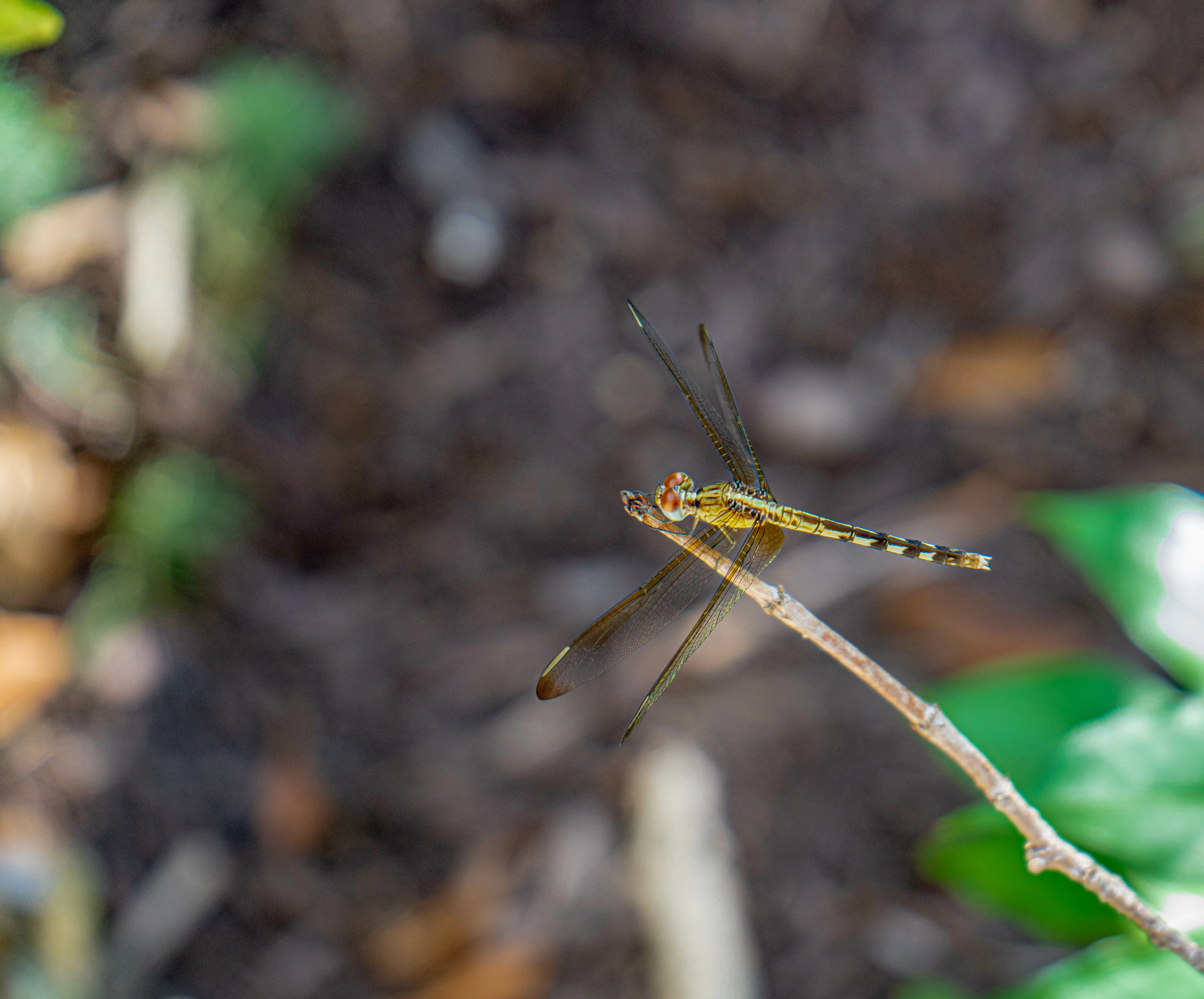 Mostly the same for the Banded Wing Dragonfly photo, although it appears the focus is soft due to missed focus or camera shake. The chromatic aberrations are green along the branch in this photo.