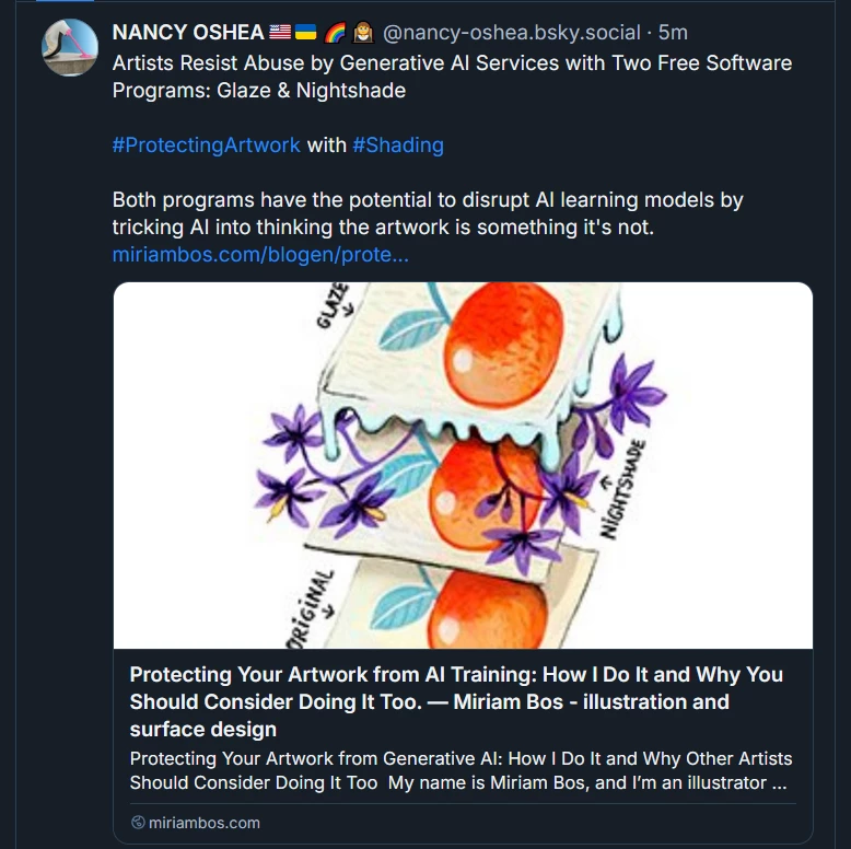 That occurred to me as well. Then again, I suspect bad AI has already been training AI, so that won't help things, either. And I'm still very unclear (as probably many of us are) as to how all this training works. Assuming one does not prompt a specific artist or style, then what percentage of pixels from how many hundreds, or perhaps thousands, or perhaps millions of images are used to create the results? Are there programming steps included in the AI software to "generalize" the outcome, as opposed to directly copying a specific image or images? I dunno.