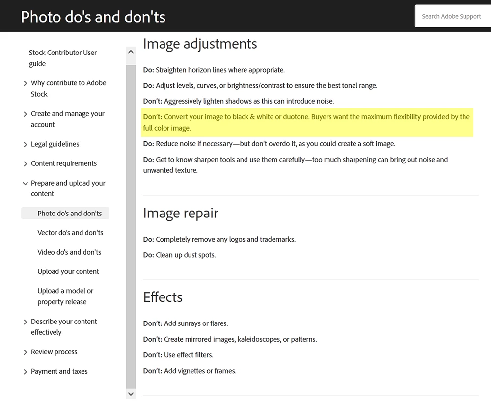 Under Photo Dos and Don'ts, Don't convert to black & white or duotone. Buyers want full color image.