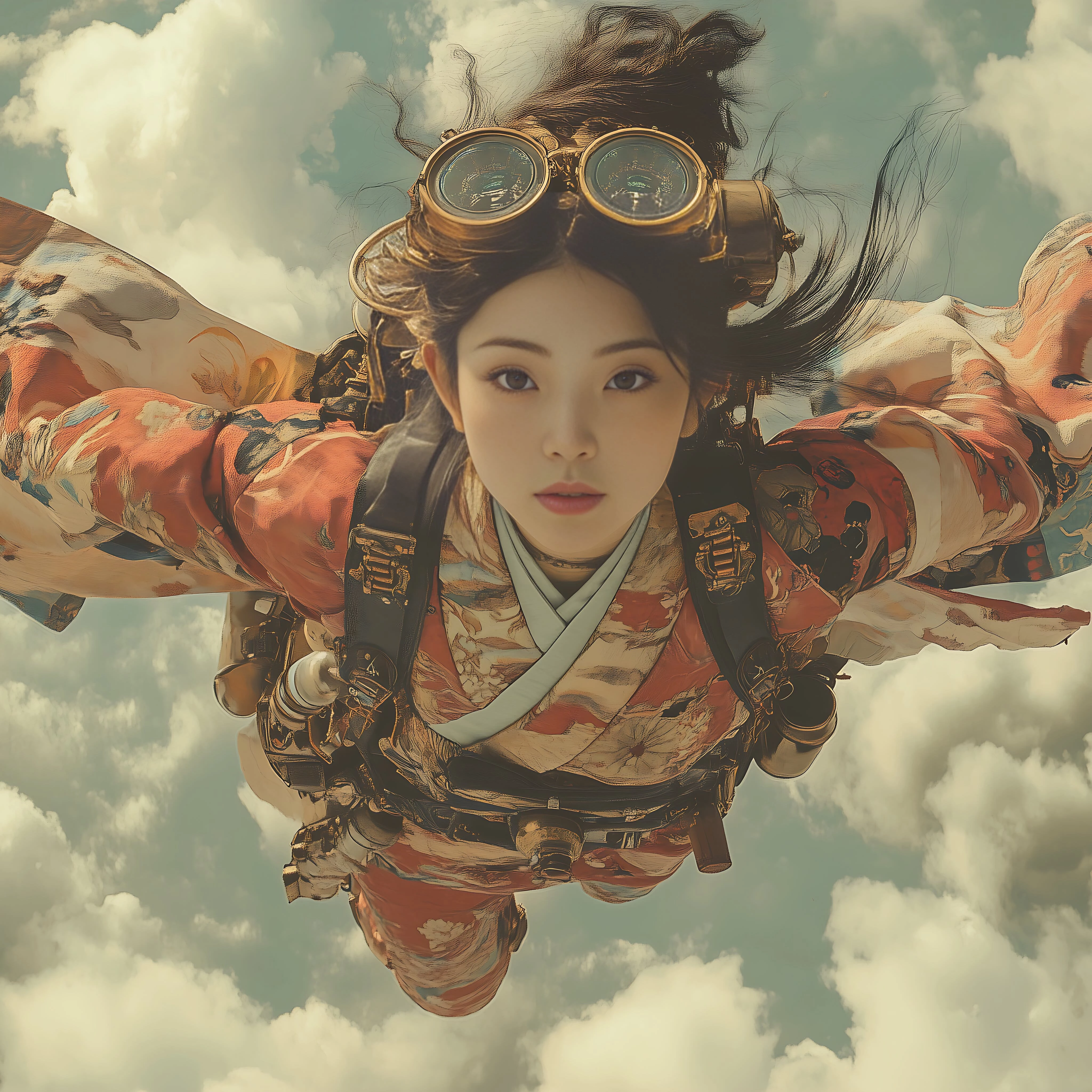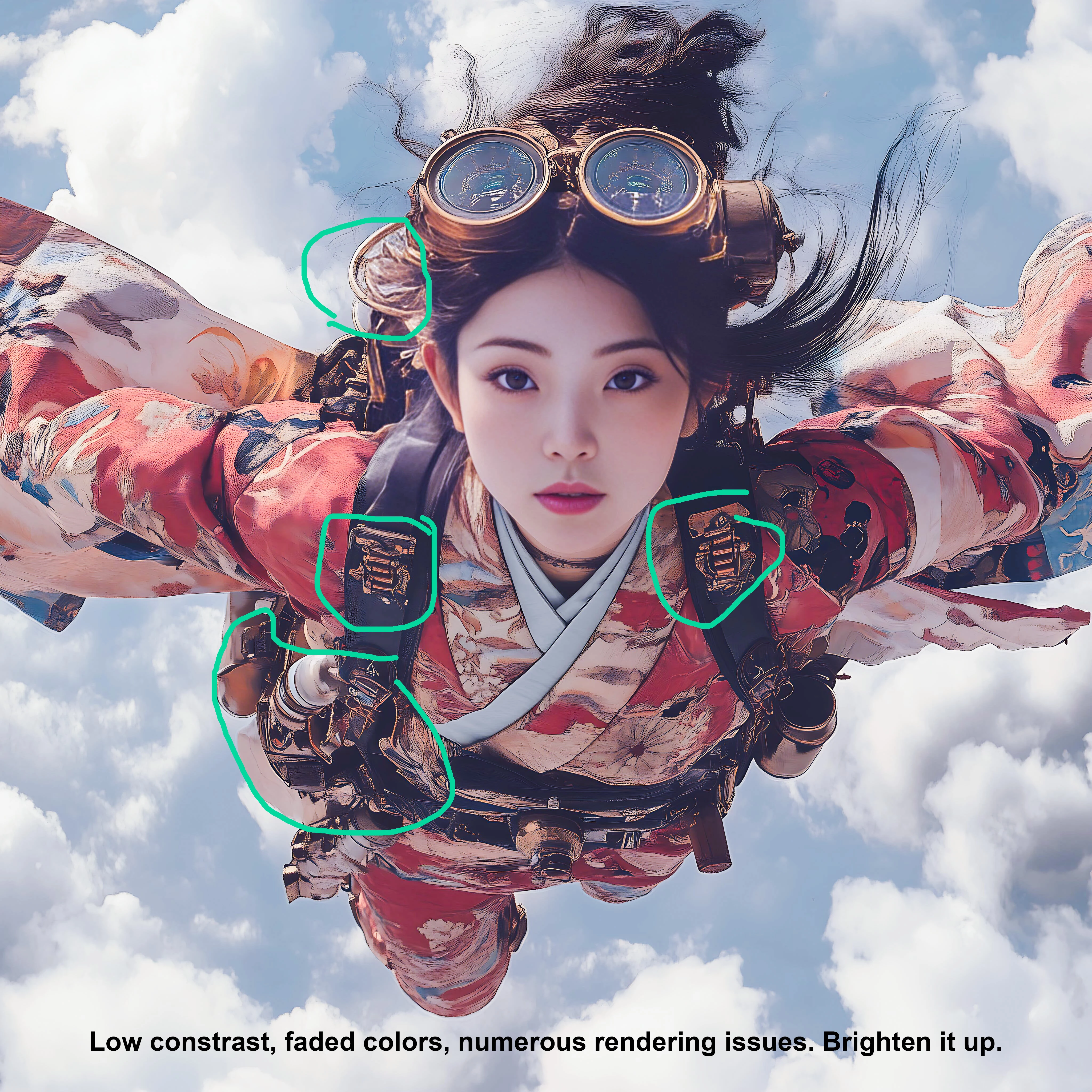 Your flying steampunk woman has flattened contrasts (you see that in the histogram which is flattened at the beginning and the end):