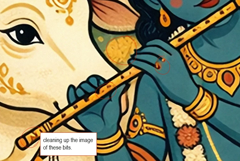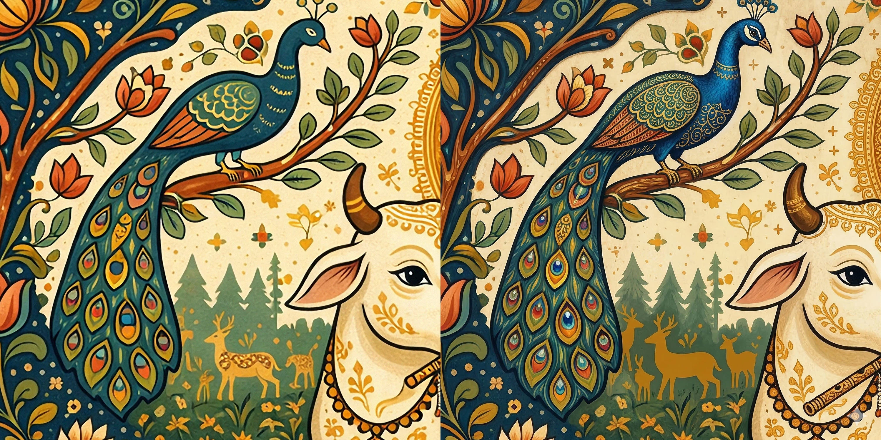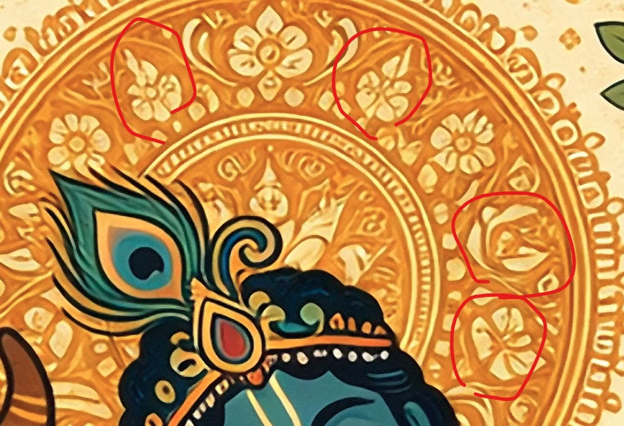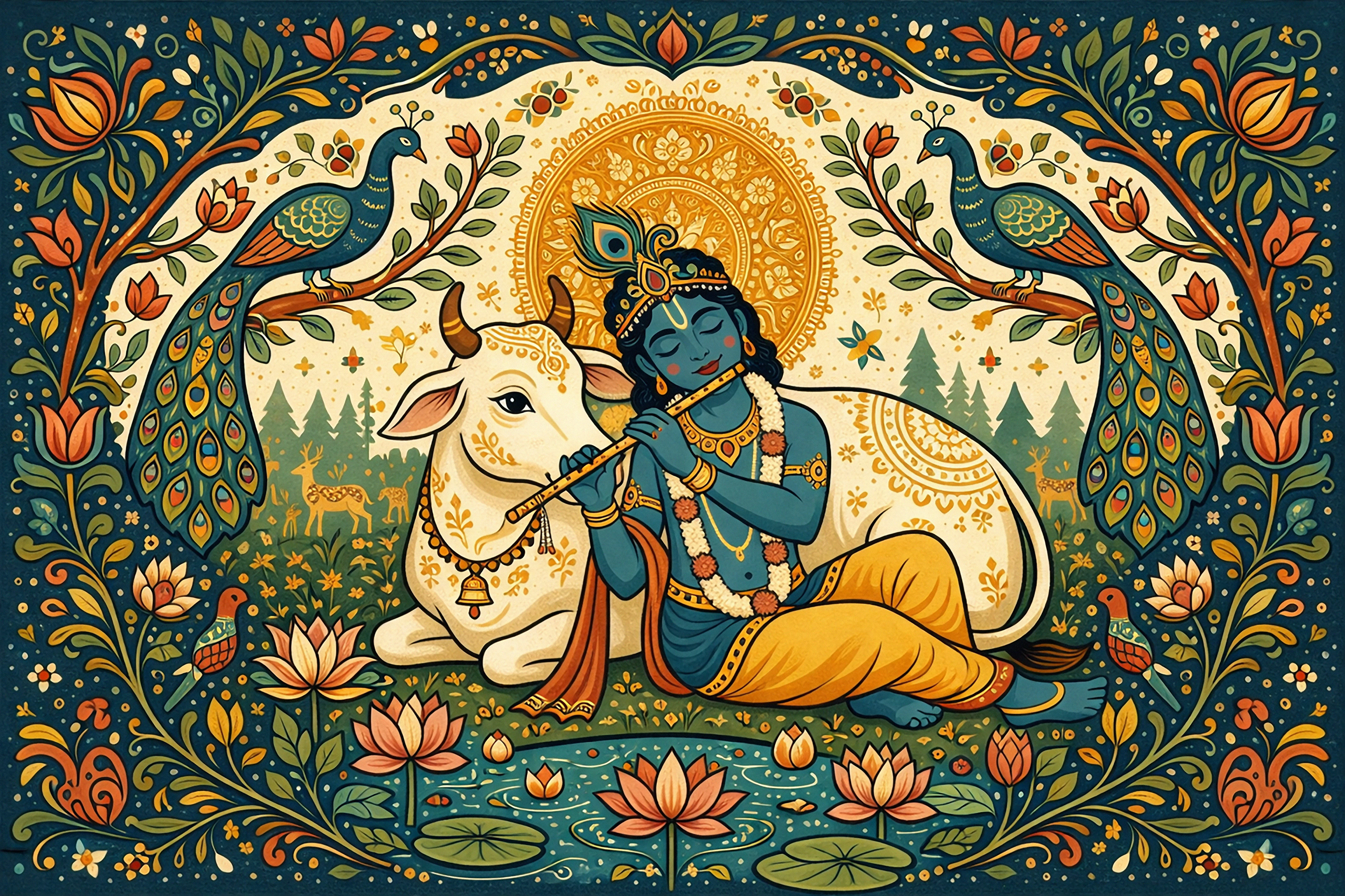 This is a Scandinavian folk art style illustration of Lord Krishna, created using AI and refined further. My intention was to keep a flat, decorative, symmetrical folk-art look rather than a realistic painting style.