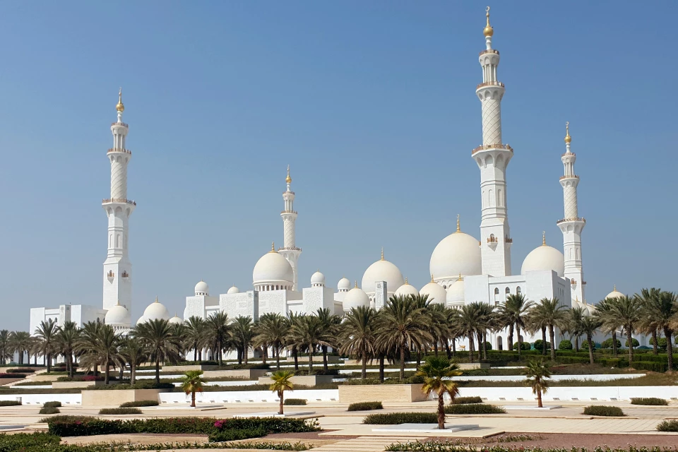 Sheikh Zayed Grand Mosque in Abu Dhabi, exterior view with domes and minarets