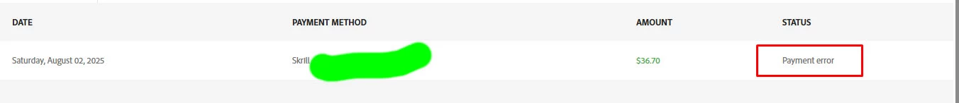 I am facing a "Payment error" issue with my latest payout of $36.70 via Skrill on August 2, 2025.