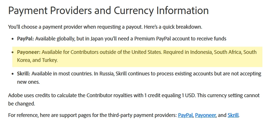 I'm new to adobe stock contributors, the user guide said that while PayPal is available globally, payoneer is required for several countries : Indonesia, south Africa, south Korea, and turkey