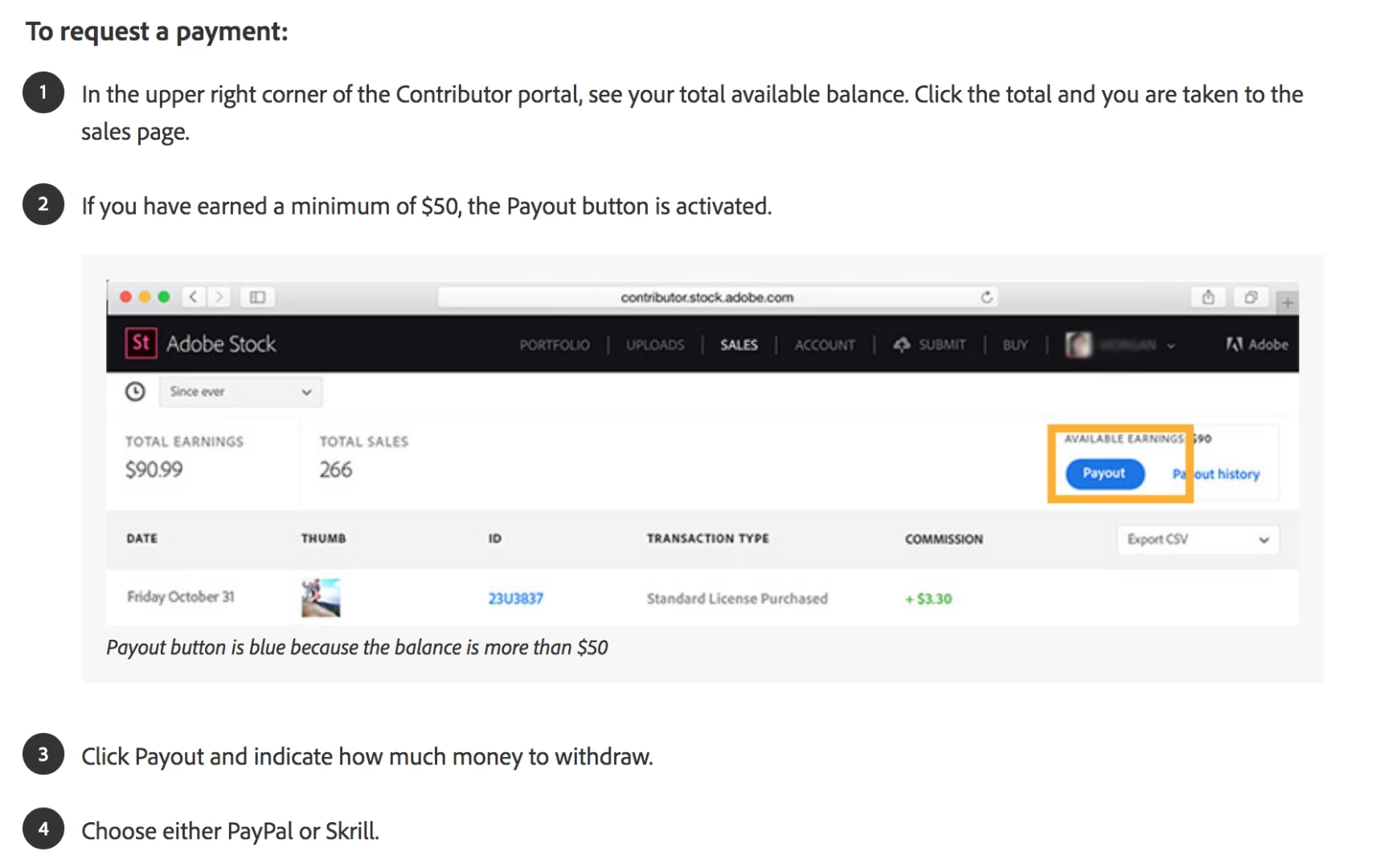 I'm new to being a contributor for Adobe stock and I've has a 70$ sale for over a month and the payout button is still grey? Everything I have read says payouts happen after the 50$ threshhold. Any thoughts?