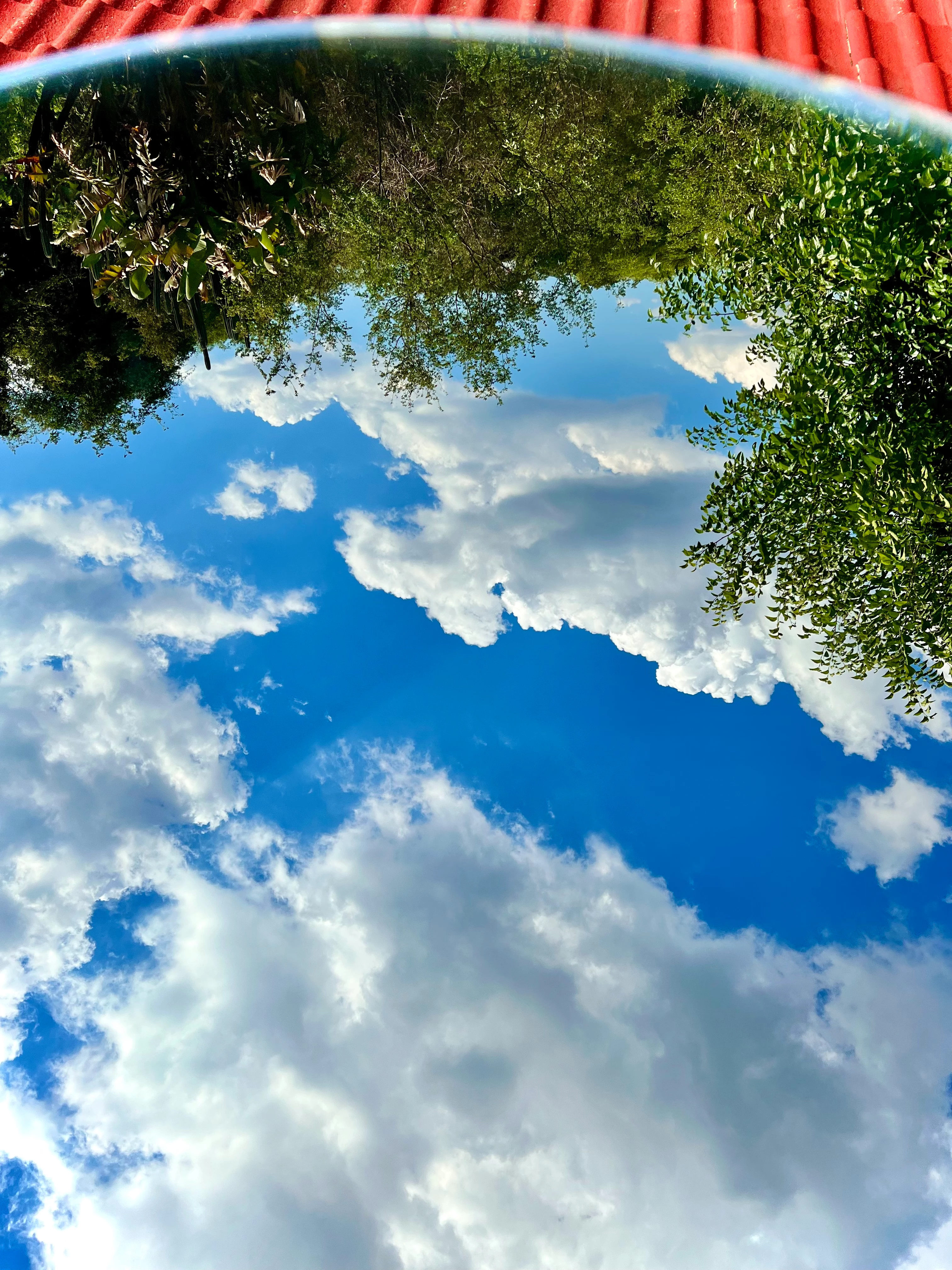 The sky reflection is not in focus. The clouds have a magenta tint.