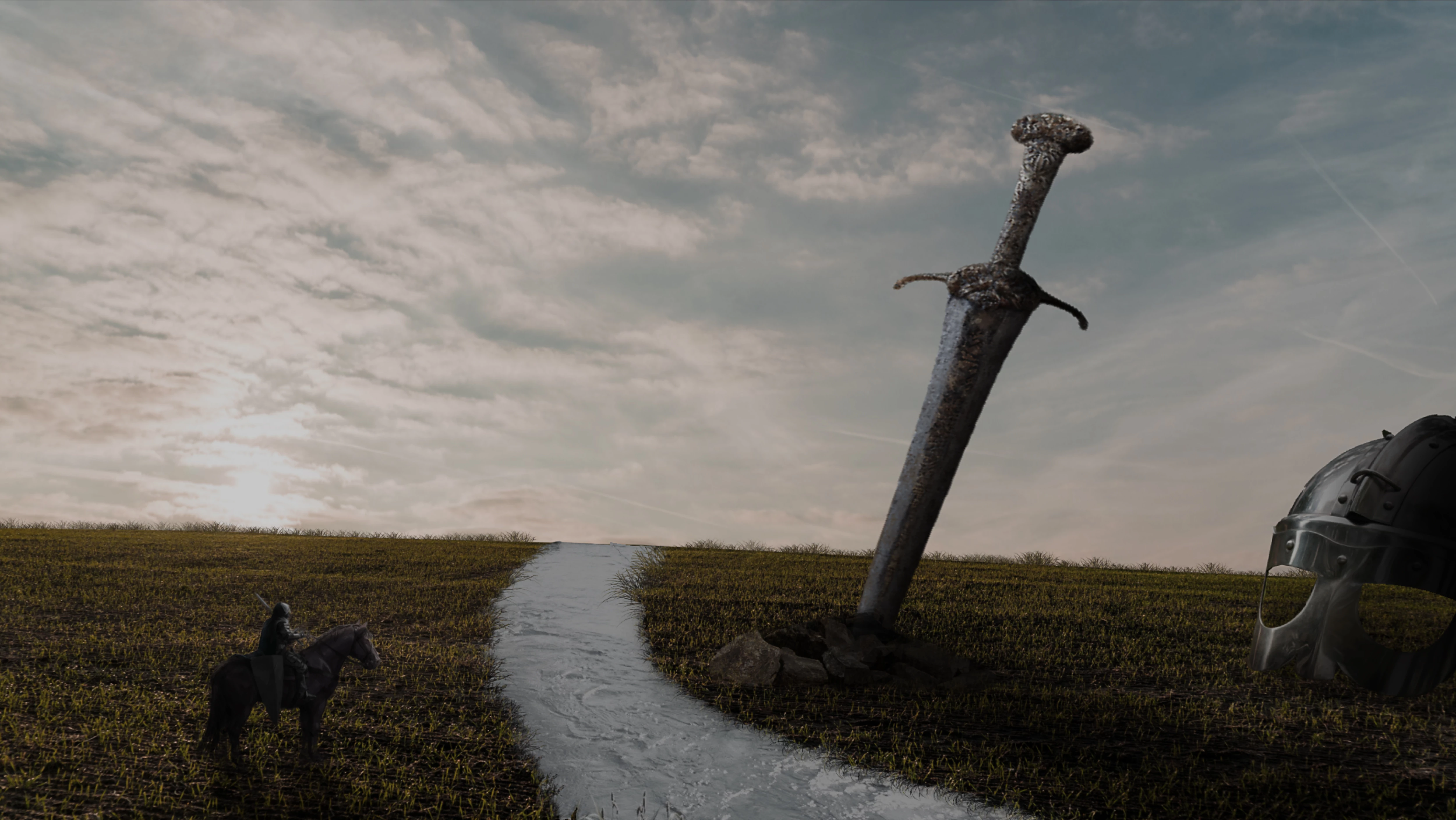 The water (if that's what it is) doesn't look natural. And I'm certain medieval knights did not have jet airplane trails in their skies.