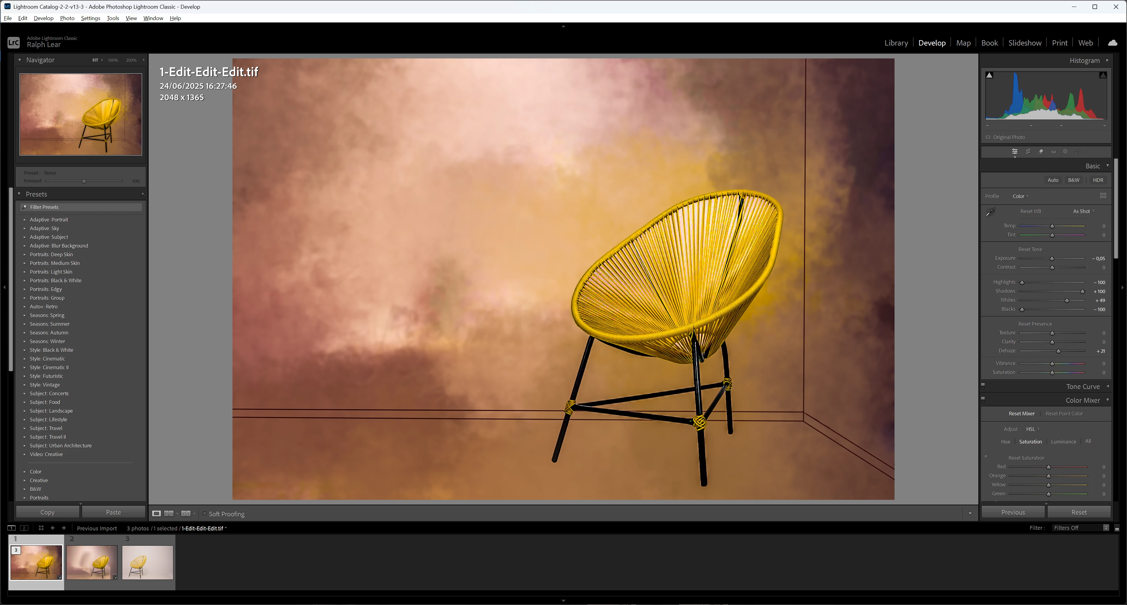 as already pointed out, the photo is not exposed well. The pixels are punched up on the right with no midtones and no blacks. That can be fixed by adding contrast. Also, the composition is not good. Your chair should be on the other side so that if someone was sitting, they would look into the photo and not out of the photo. Also, you will need a property release for the chair design. That all has nothing to do with the camera. That is basic photography.